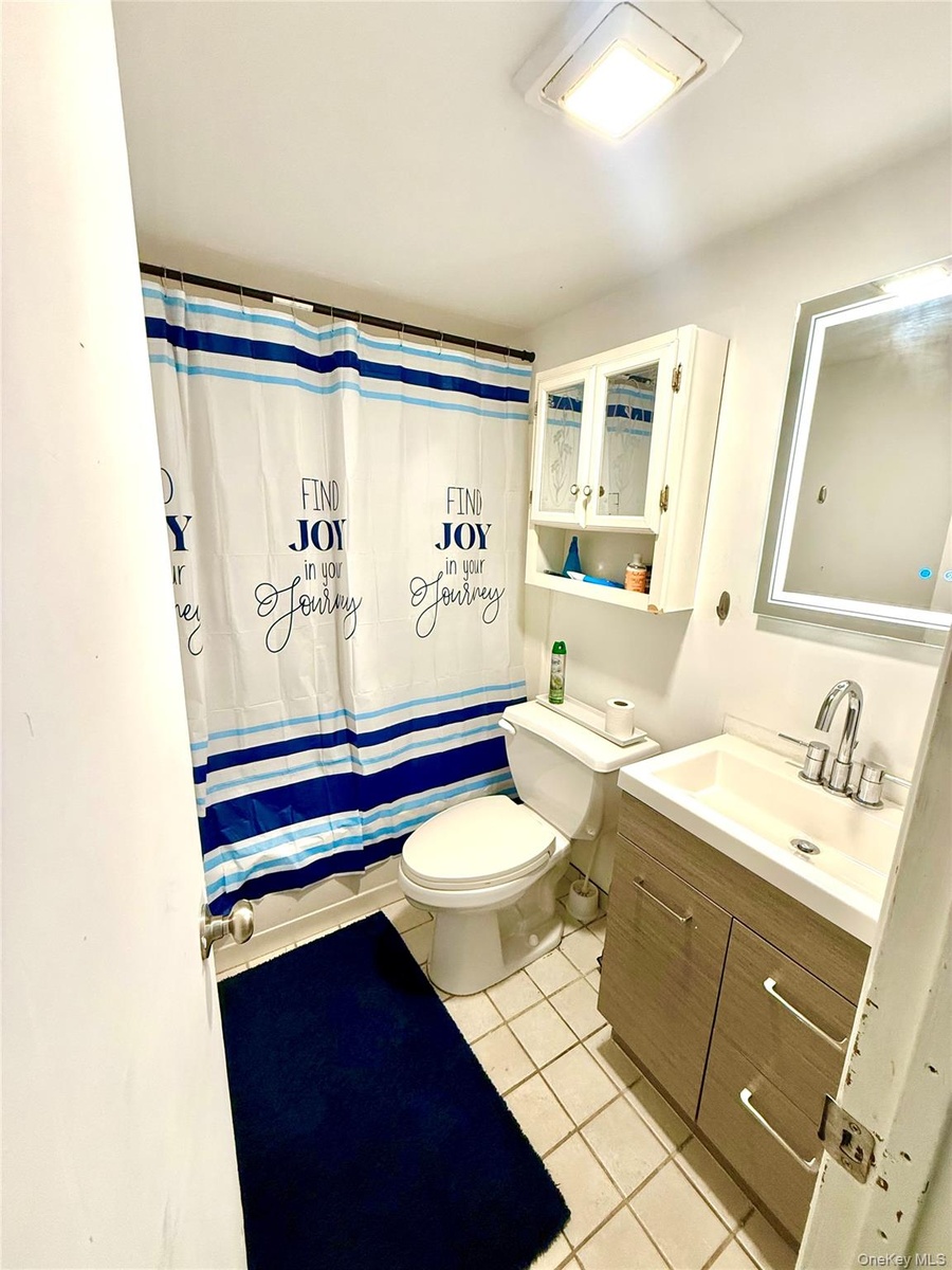 - Full bath featuring tile patterned flooring, toilet, vanity, and a shower with curtain