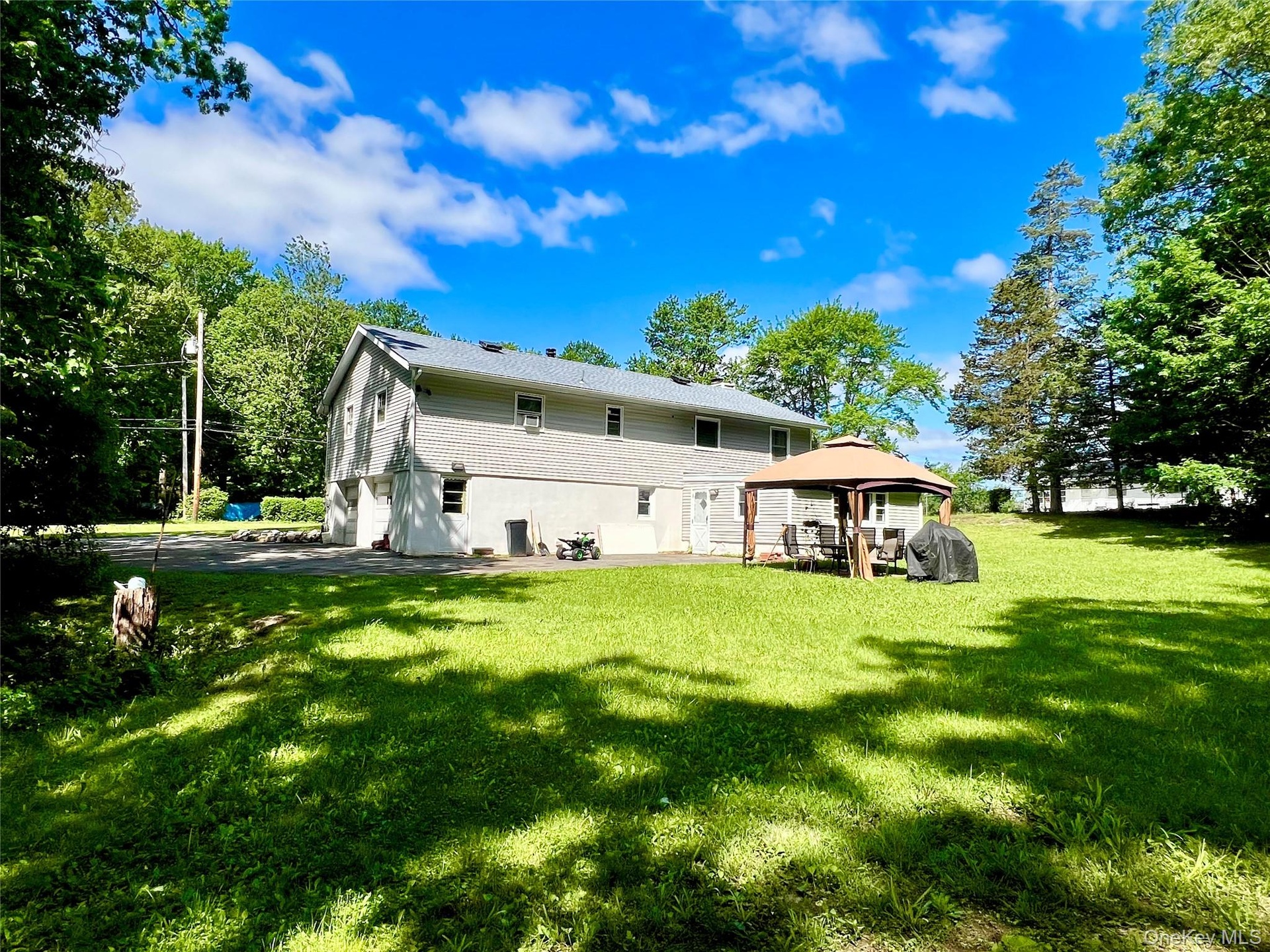 - Back of house with a gazebo, a patio, a yard, and an attached garage