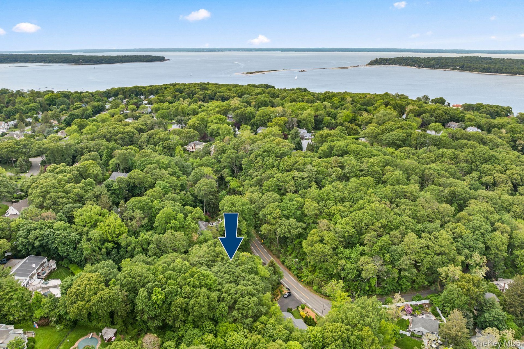 - Aerial view of a nearby body of water and a forest