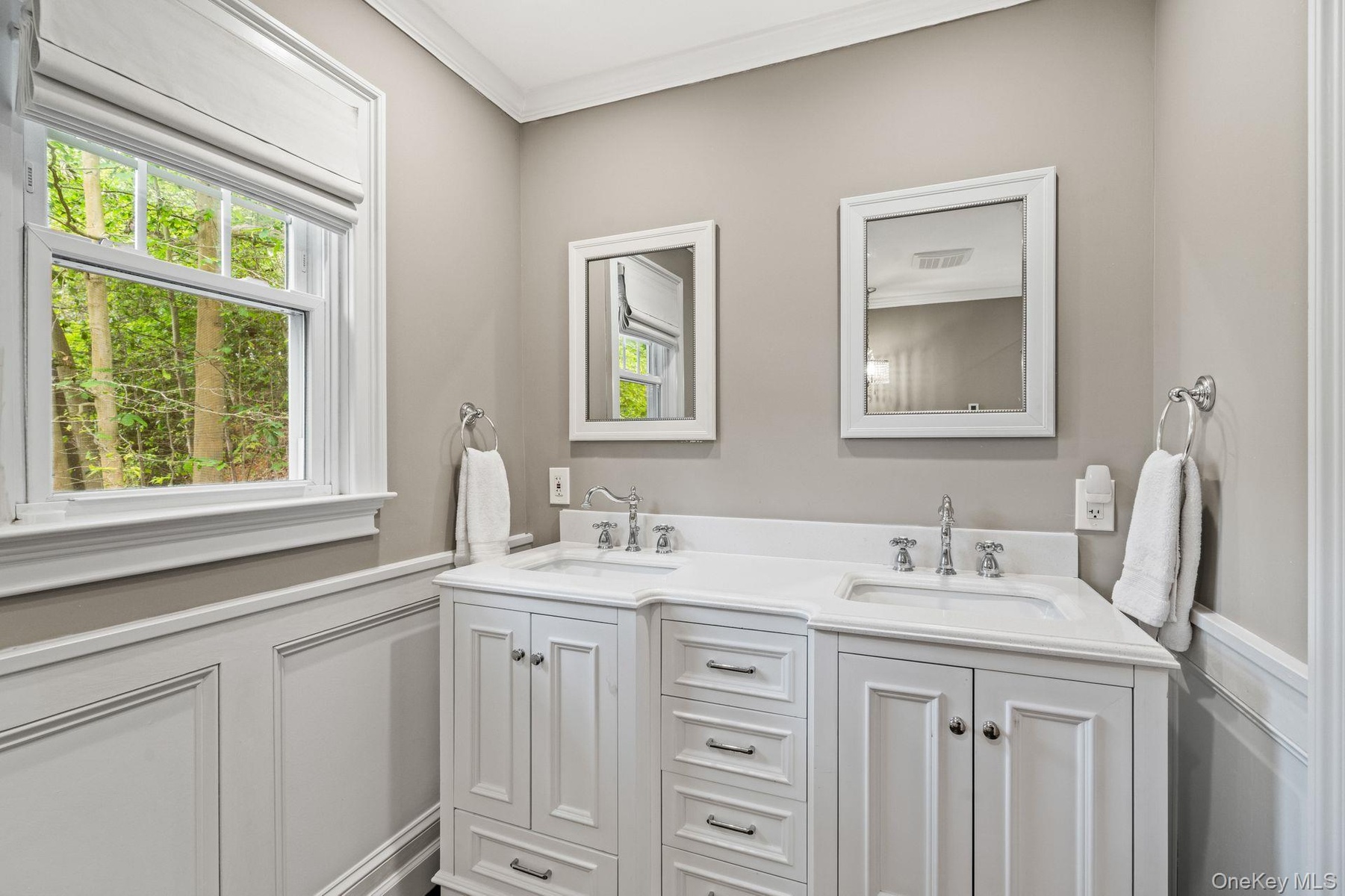 - Full bathroom with double vanity, ornamental molding, a wainscoted wall