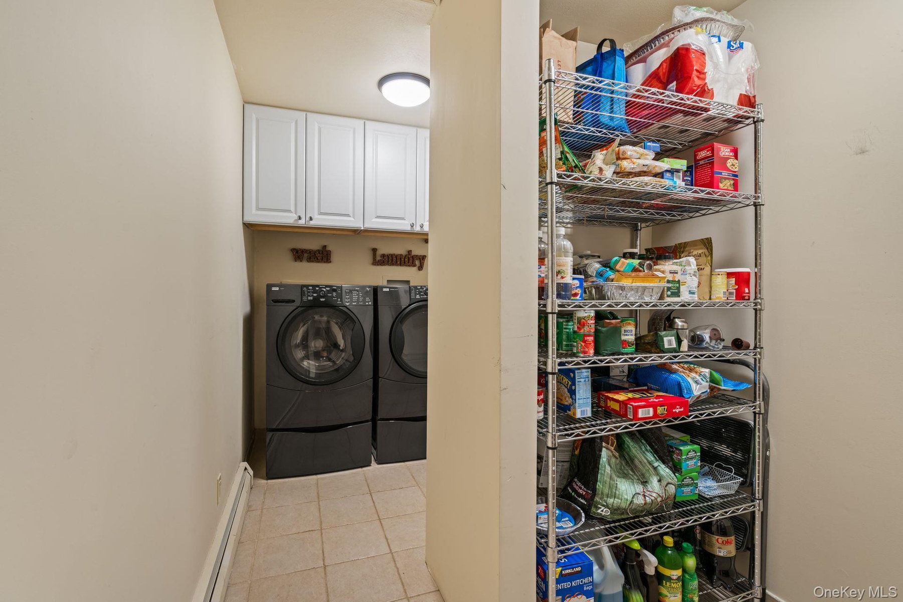 - Washroom featuring separate washer and dryer, cabinet space, light tile patterned flooring and extra Storage