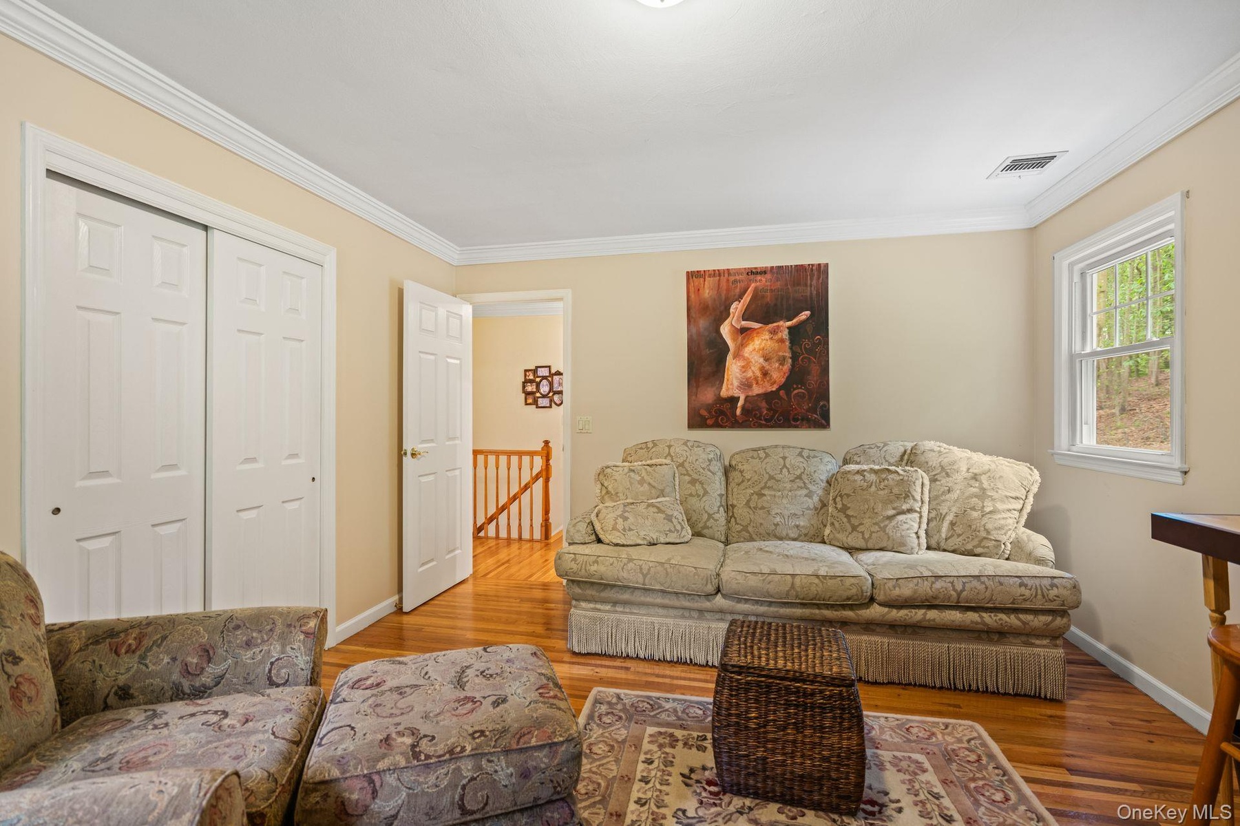- Living area with ornamental molding, light wood-style flooring, plenty of natural light, and recessed lighting