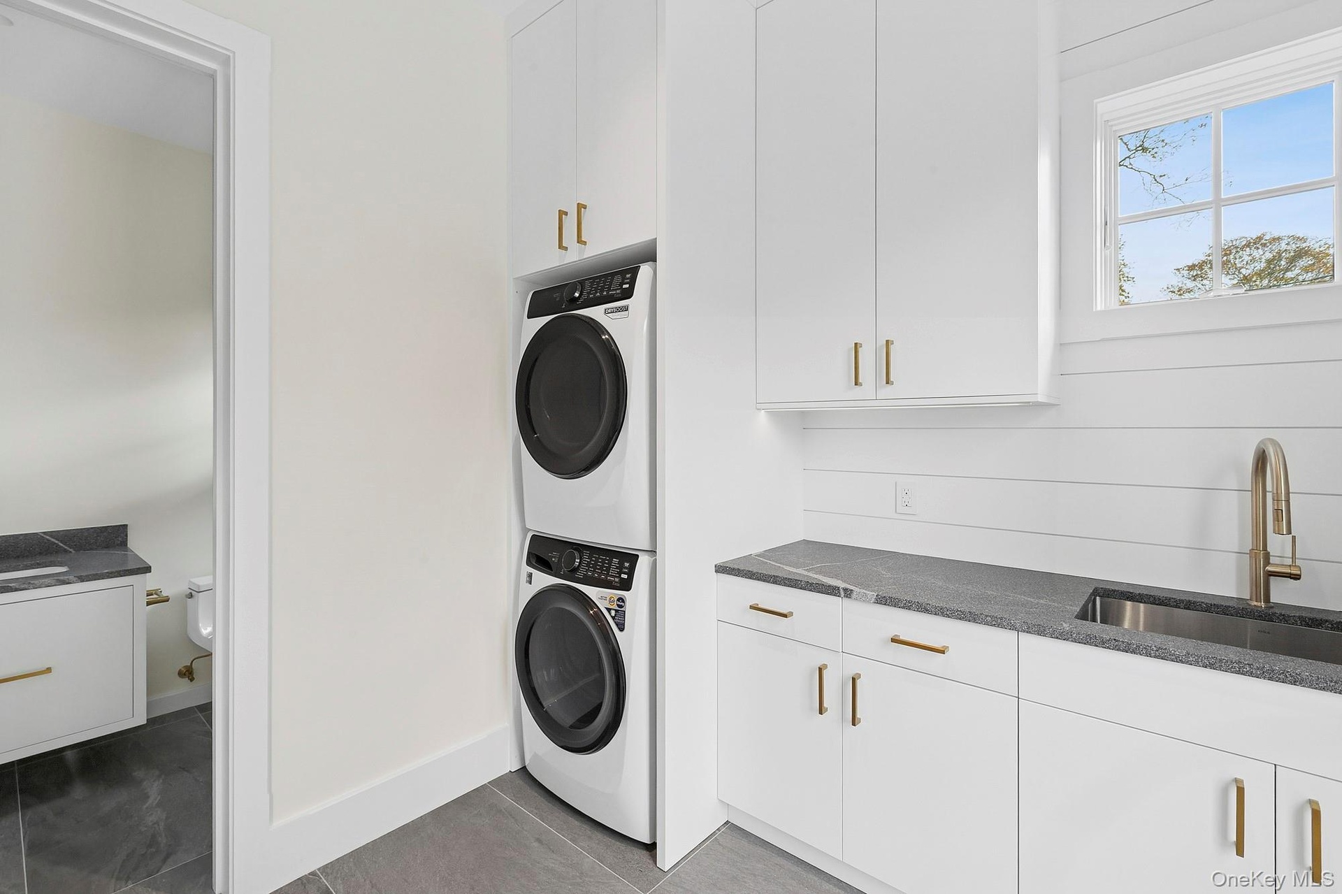 - Washroom with cabinet space and stacked washer and clothes dryer
