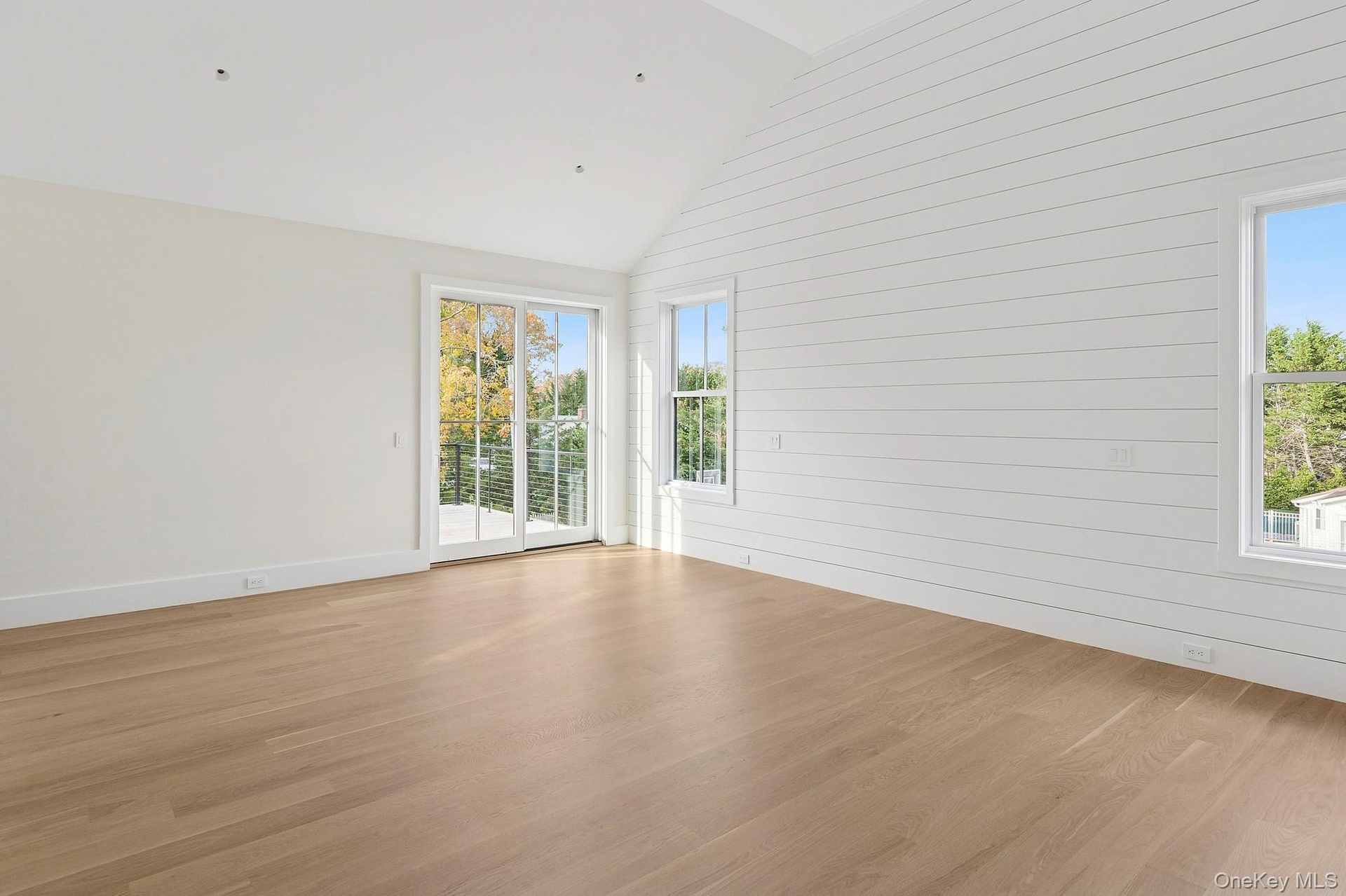 - Spare room featuring light wood finished floors, high vaulted ceiling, and wood walls