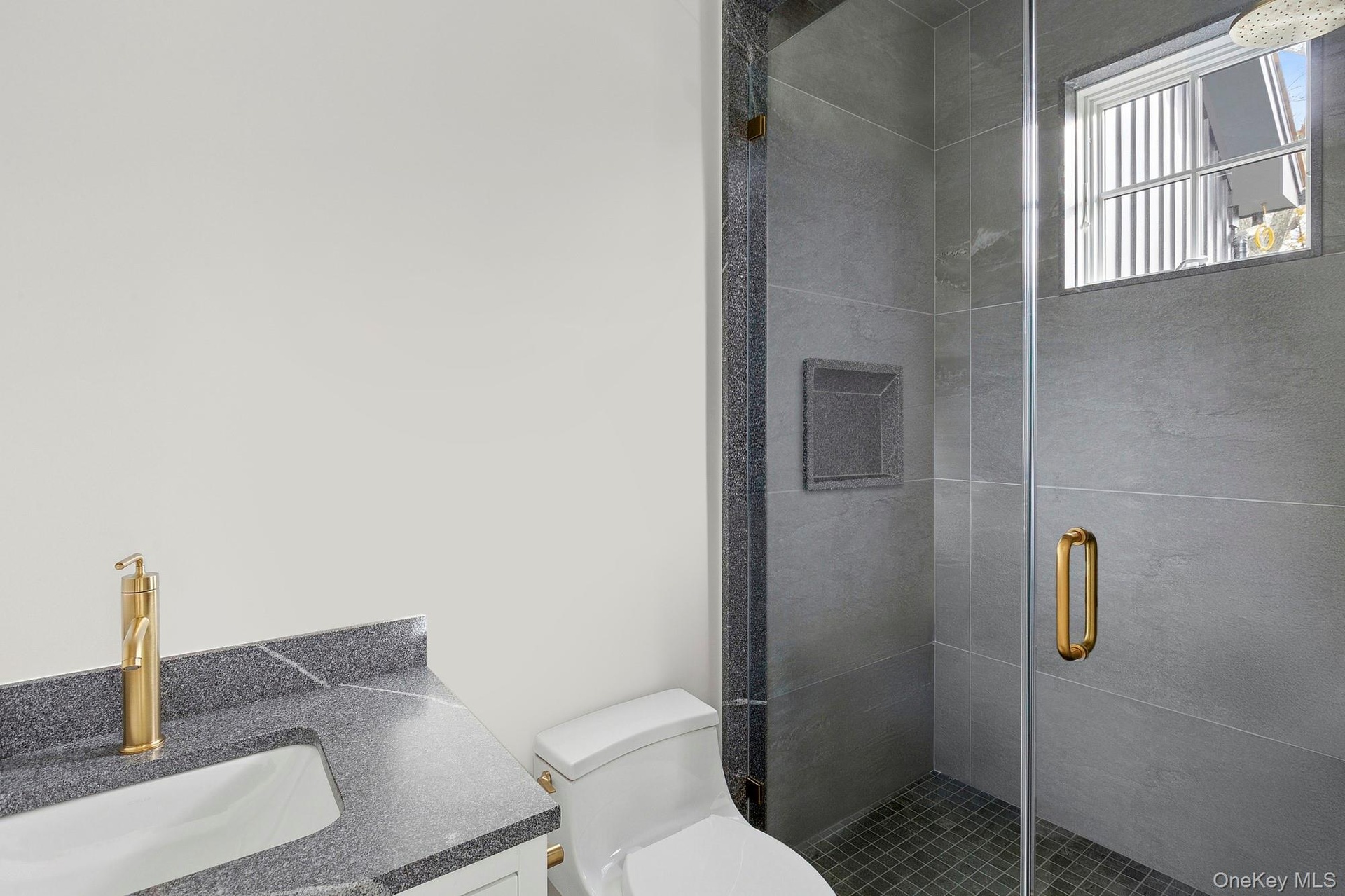- Bathroom featuring a shower stall, vanity, and dark tile patterned flooring