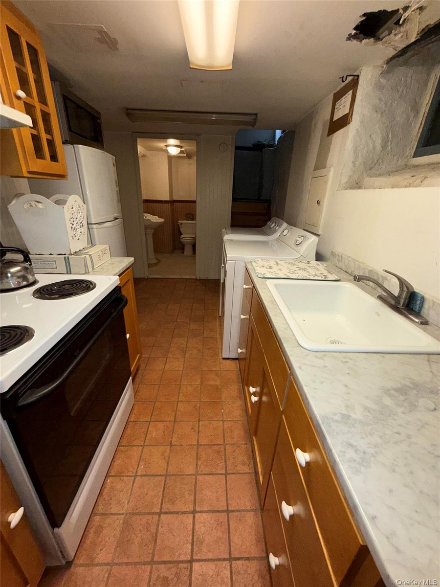 - Kitchen featuring electric range oven, independent washer and dryer, a sink, brown cabinets, and light countertops
