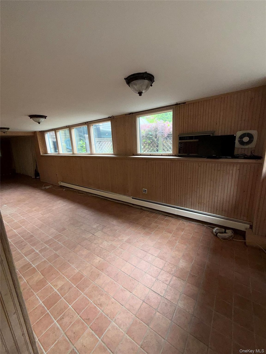 - Spare room featuring wood walls and a baseboard radiator