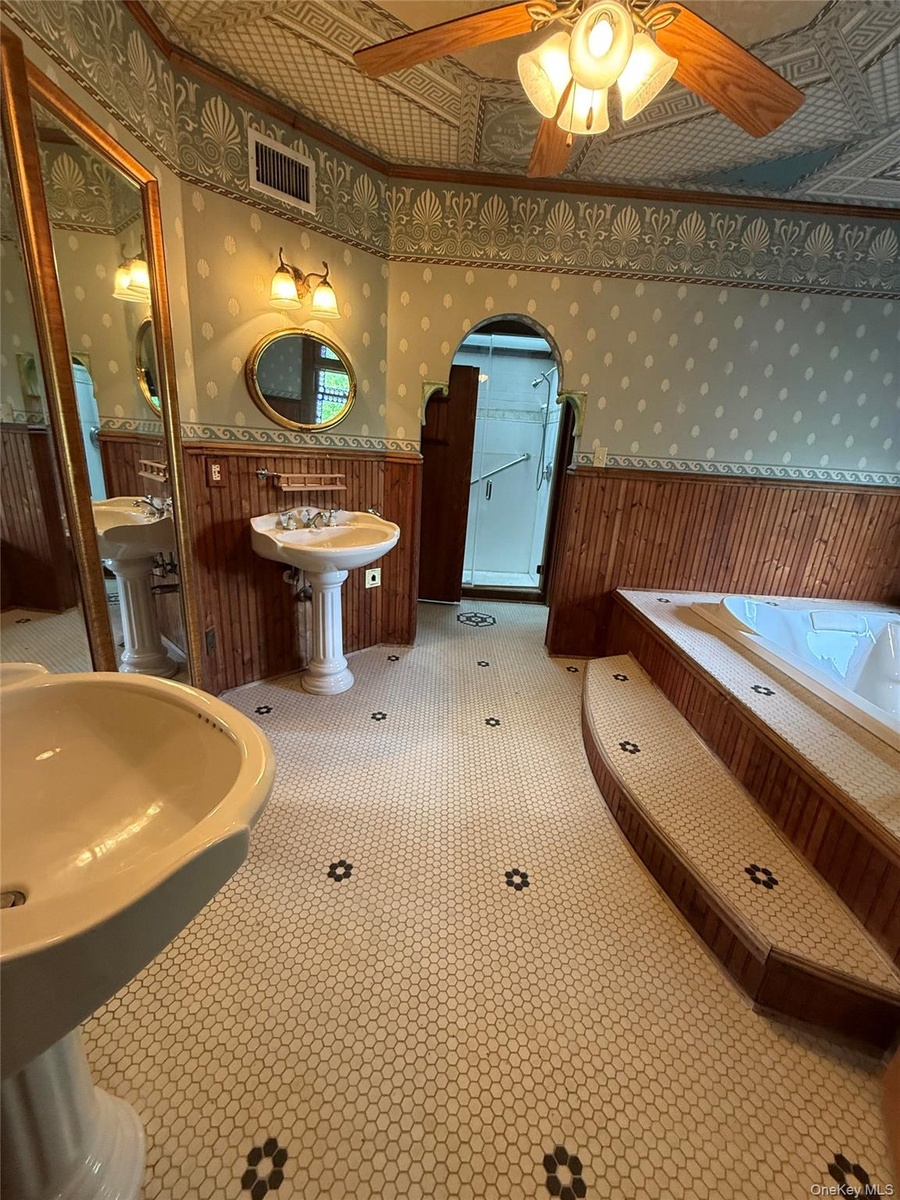 - Bathroom featuring wallpapered walls, wainscoting, a bath, a ceiling fan, and wooden walls