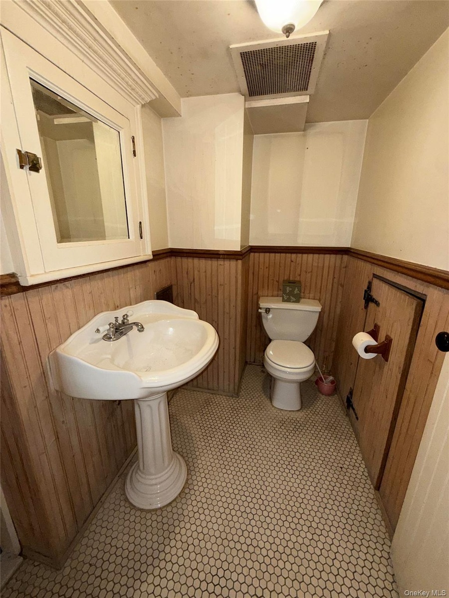 - Half bathroom featuring a wainscoted wall, toilet, and wood walls