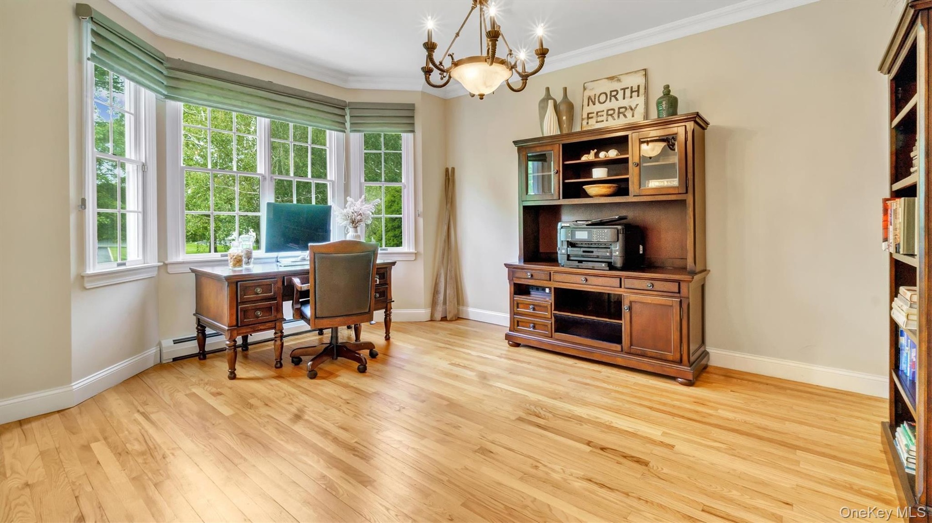- Home office featuring light wood finished floors, a chandelier, and crown molding.