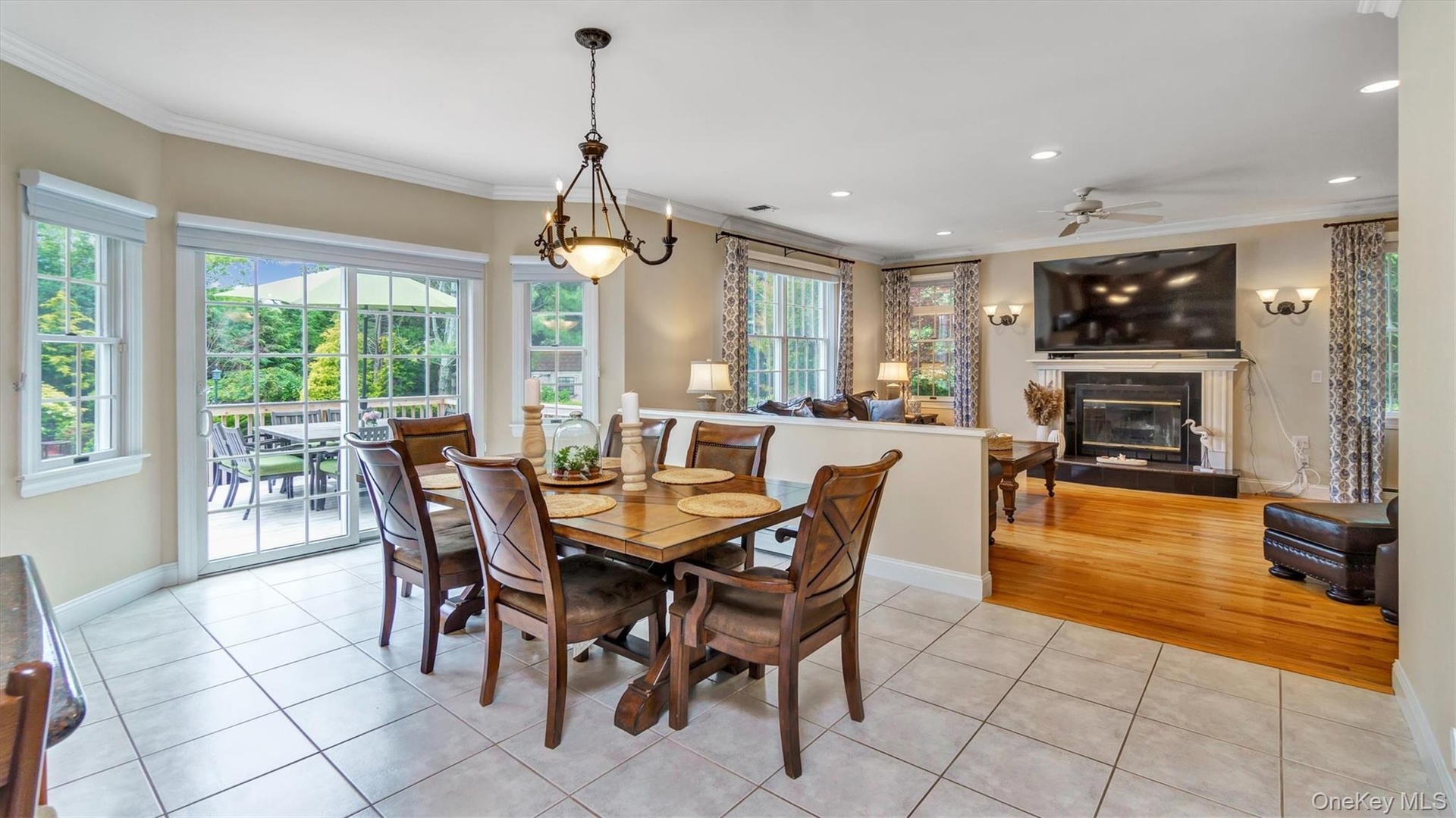 - Dining space with crown molding, light tile patterned floors, a gass fireplace, a ceiling fan, and baseboards