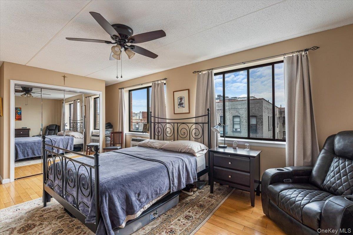- Bedroom featuring hardwood / wood-style floors, a textured ceiling, a view of city, a wall mounted air conditioner, and ceiling fan