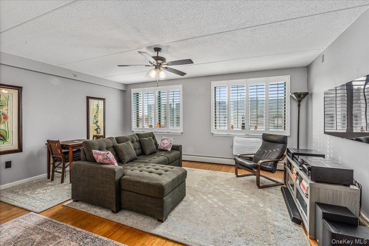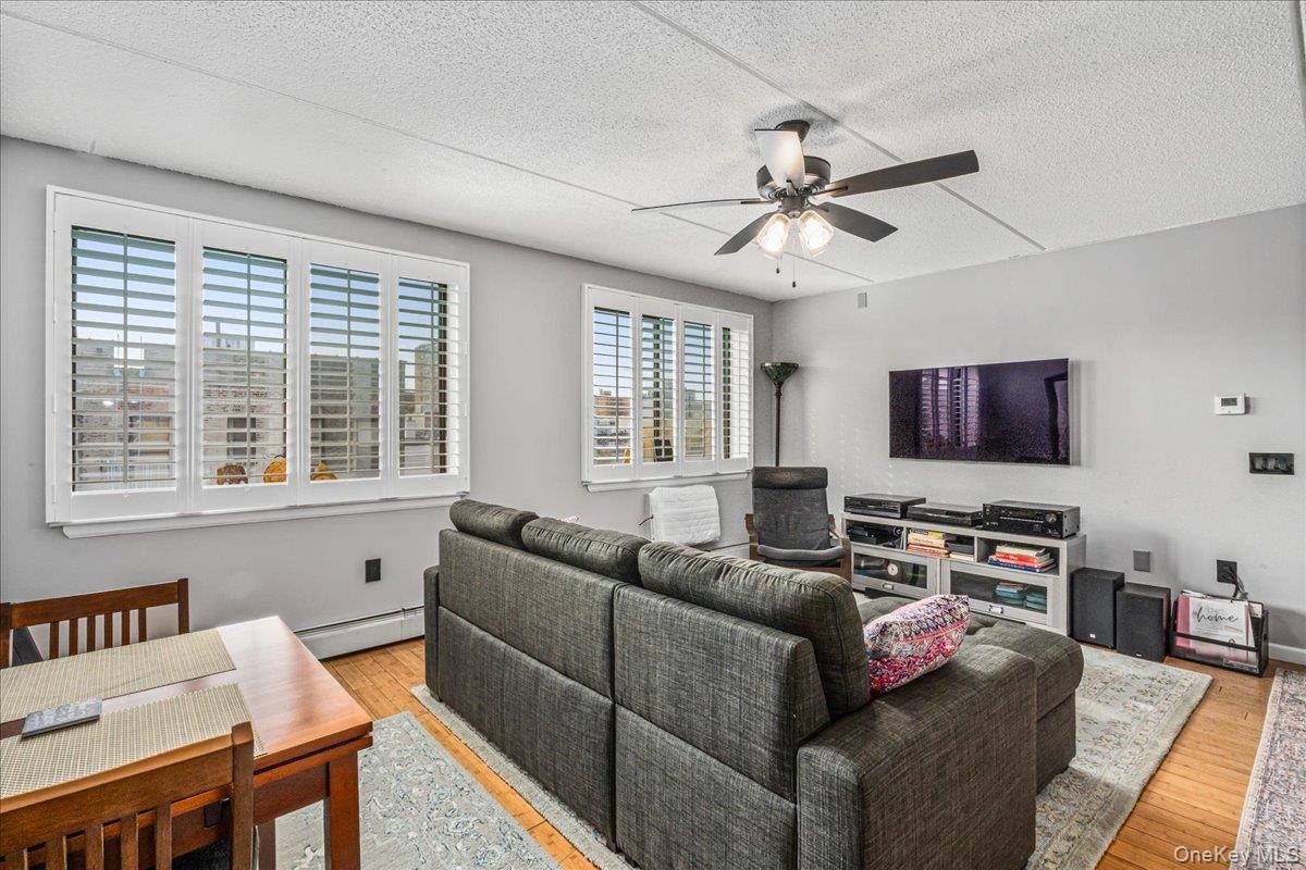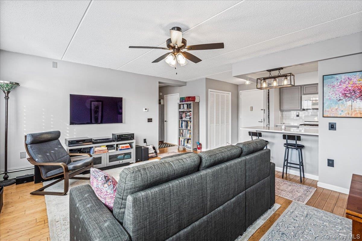 - Virtual Staging: Living area featuring light wood-style floors and a ceiling fan