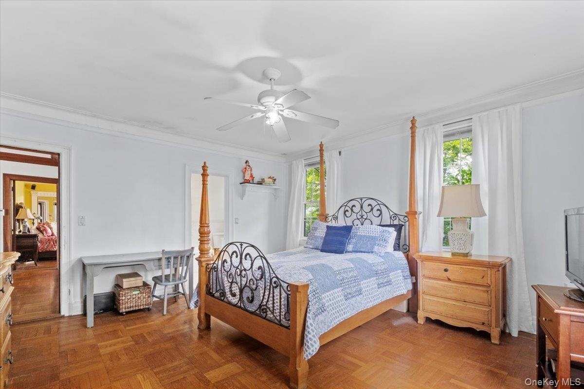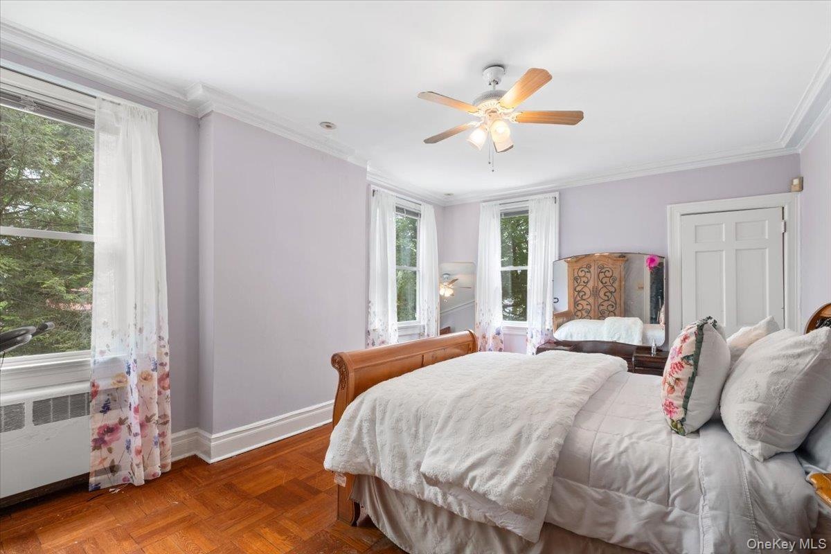 - Bedroom with radiator heating unit, ornamental molding, multiple windows, and a ceiling fan