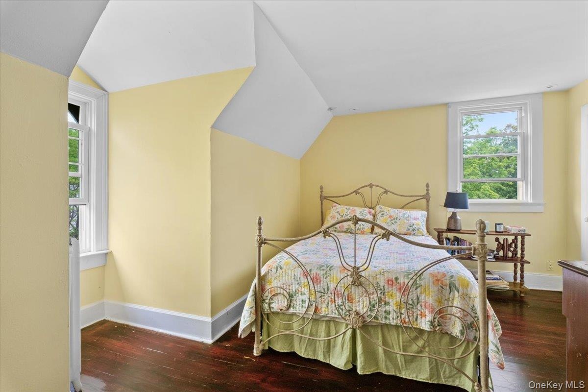 - Bedroom with wood-type flooring, multiple windows, lofted ceiling, and baseboards