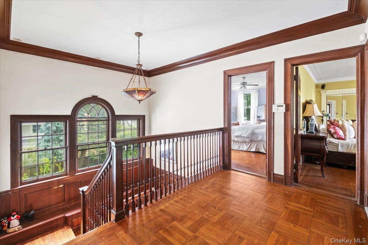 - Hall featuring an upstairs landing, plenty of natural light, and ornamental molding