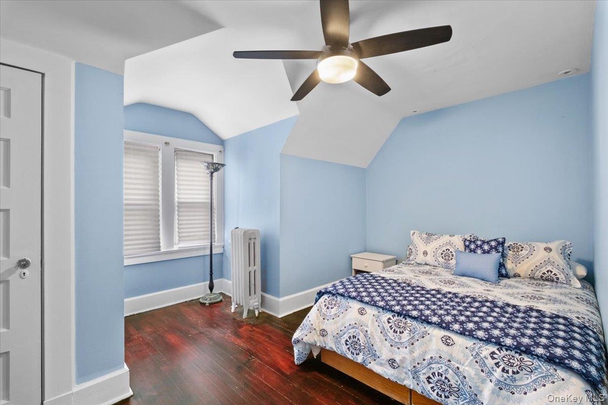 - Bedroom with radiator heating unit, baseboards, wood-type flooring, vaulted ceiling, and ceiling fan
