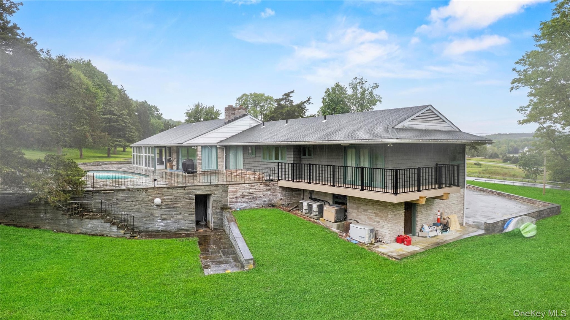 - Back of house featuring a chimney, a lawn, a pool, and a balcony