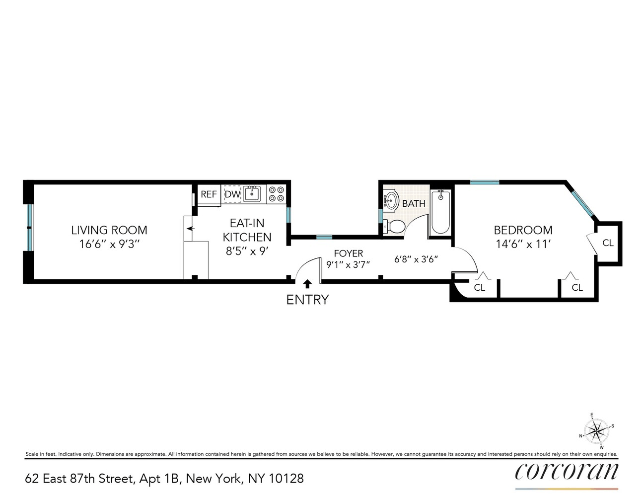 62 East 87th Street, Apartment 1B (high 1st floor). Charming 1BR /1BA apartment on Manhattan's Upper East Side in prime Carnegie Hill between Park and Madison Avenues - just 1 block from Central Park. Pleasant street views from the living room and a blissfully quiet bedroom located at the back of the apartment. 10-foot ceilings and beautiful hardwood floors are part of the prewar details in this 1923 boutique co-op. Kitchen has a dishwasher and breakfast counter. The coop permits 75% financing, pied-a-terre ownership, guarantors and parents purchasing with children. Service dogs are permitted . Storage and laundry in the basement. Elevator building. There is an ongoing reserve assessment of $24.91.