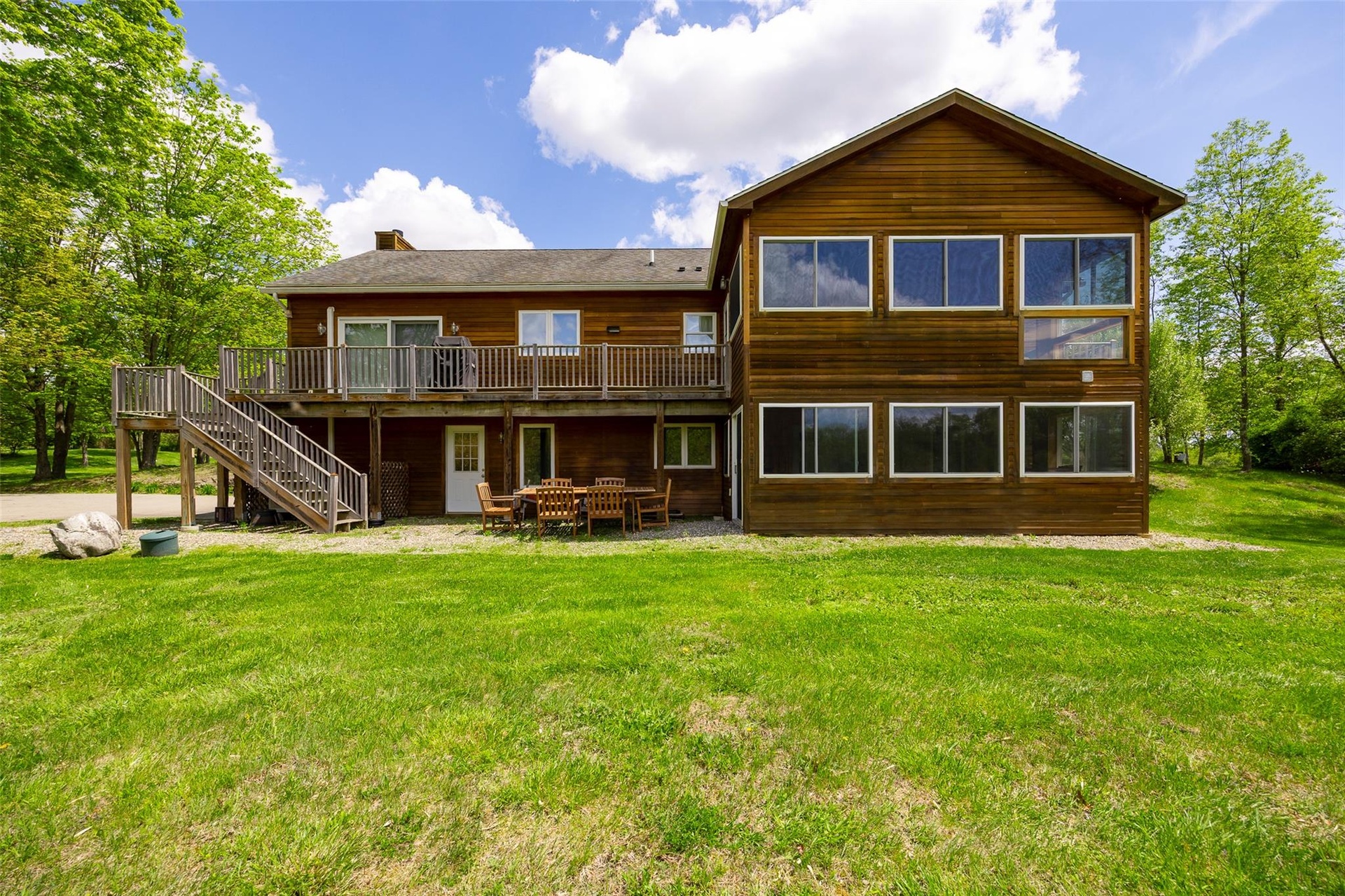 - Rear view of property with a wooden deck, stairs, a yard, a chimney, and a patio area