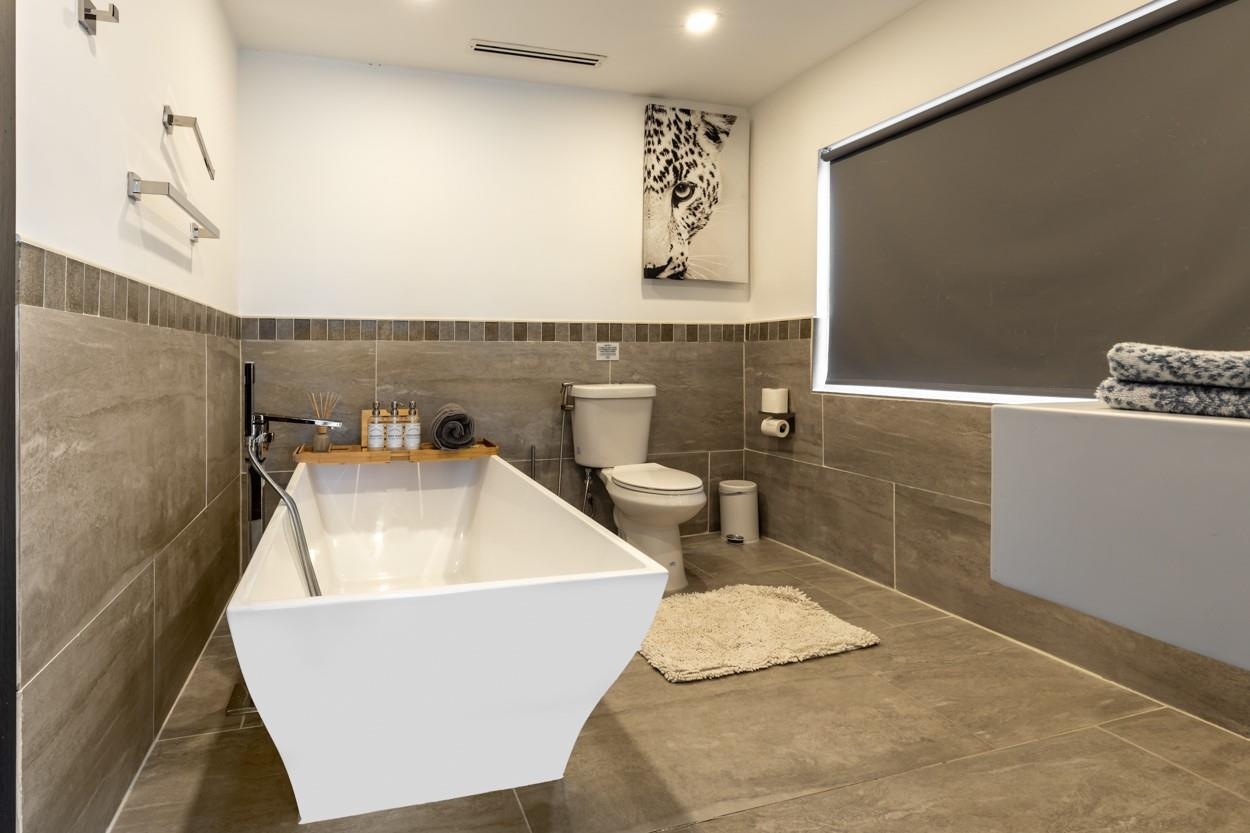 - Full bathroom featuring a freestanding bath, toilet, tile walls, and a wainscoted wall