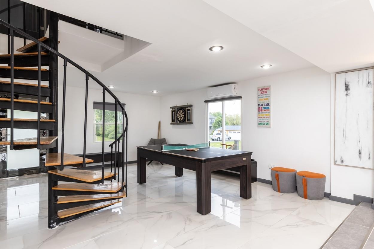 - Game room featuring a wall unit AC, baseboards, recessed lighting, marble tiled flooring, and billiards