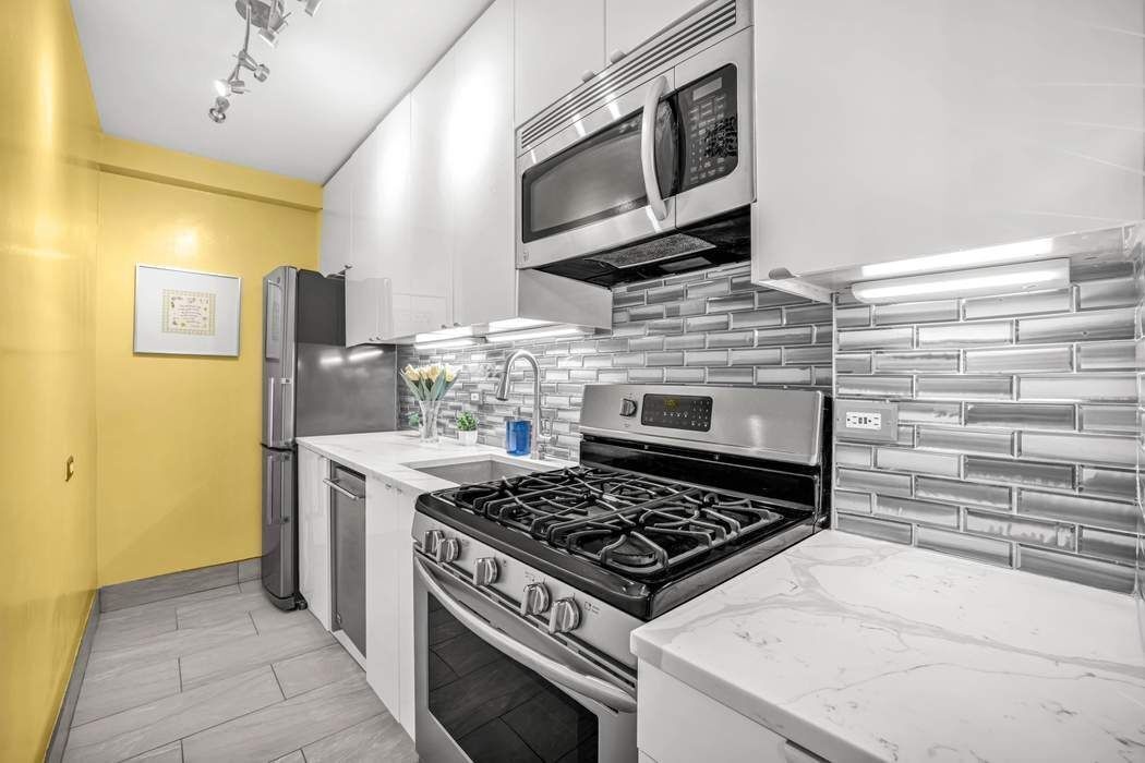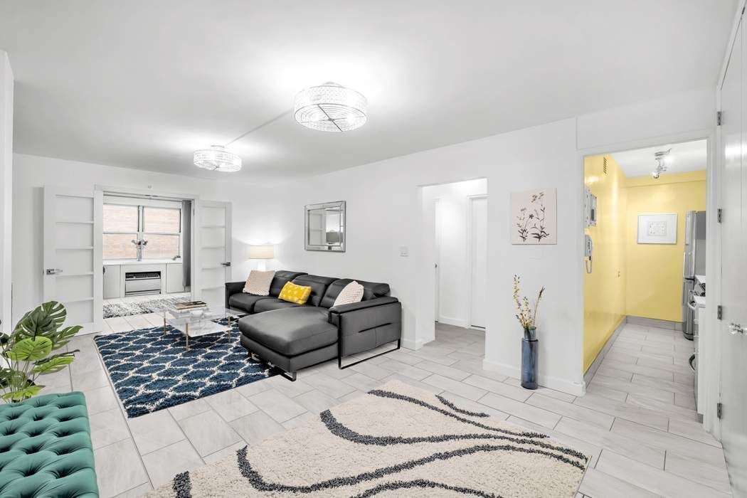 The immense, 30-foot-long living room provides fantastic flexibility, allowing it to be arranged as two distinct spaces - for dining, a home office, or even a second bedroom. Beyond the beautifully renovated kitchen, a large pantry closet provides abundant storage. Down a short hall past the renovated bathroom, the quiet bedroom offers a peaceful retreat. The bedroom is well-appointed with custom overhead storage and a walk-in closet and is flanked by three additional closets in the hall.