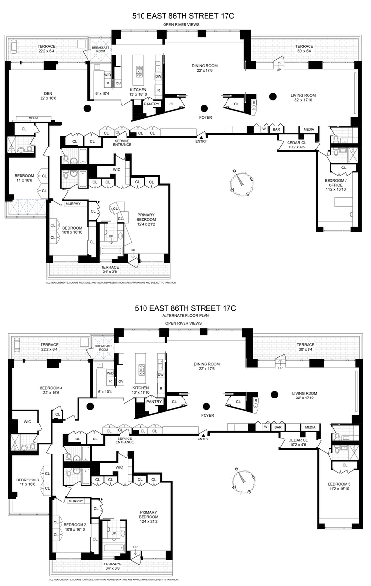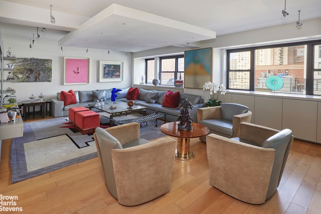 Architecturally distinctive, the dramatic entry gallery features two floating concrete walls, each displaying artwork in an almost "gallery-like" setting. From there you enter the double size Formal Dining Room. This space is large enough for 2 square tables seating 8 at each, or a long harvest-like table, which 14+ can dine. From this room, the exposure is Northeast and includes 6 windows of open city and East River views. The room feels almost loft-like until you close the 3 sets of fluted glass pocket doors - turning the room into a warm intimate space. A grand scale Living Room is parallel to the Dining Room. It too enjoys 6 windows of open city and East River views! This room opens to the main Northeast facing terrace (30 X 6 ft.), which is a perfect extension of the Living Room. A mirrored wet bar and a half bath complete the Living Room. Adjacent to the Living Room is the 4th Bedroom/Office with an en-suite full bath and cedar closet. This room currently functions as an office with custom designed wood cabinetry including extensive storage, shelving and a built-in desk. The exposure is South with open city views.