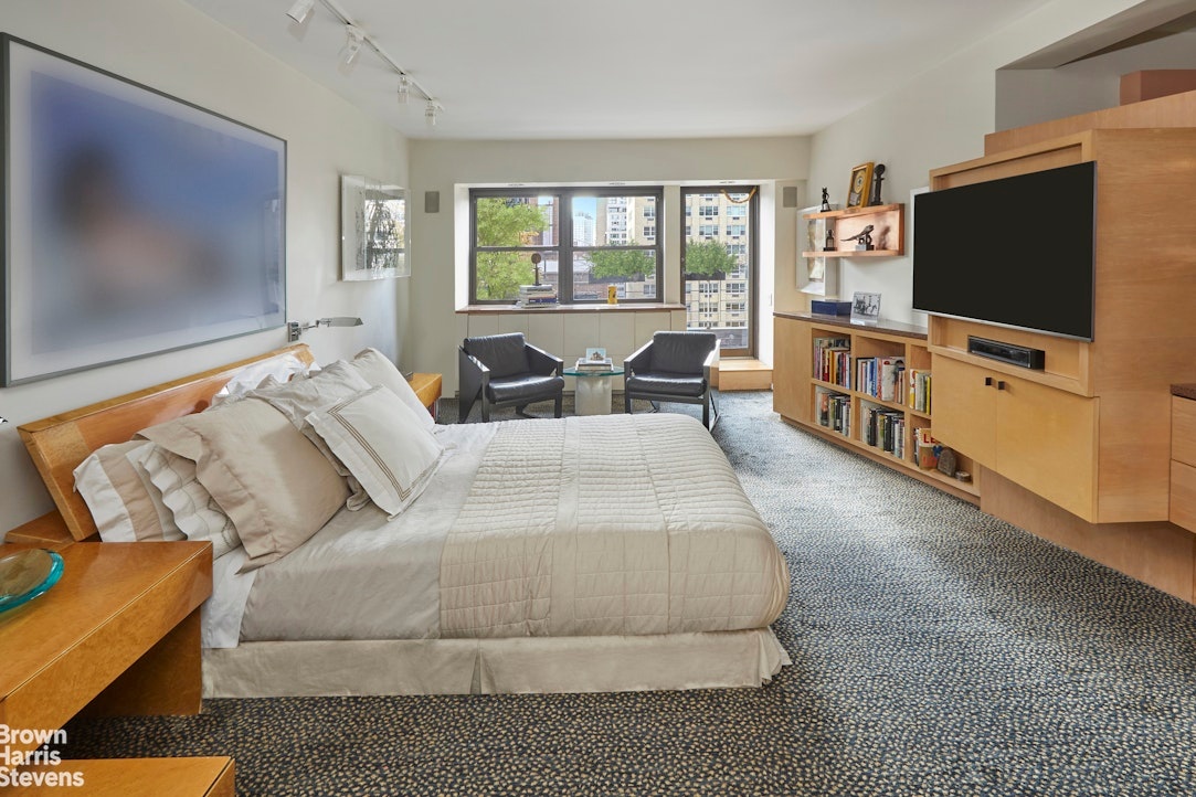 Two additional rooms complete the North side of the apartment. The Kitchen: a stunning stainless steel chef's, eat-in Kitchen features a Subzero Fridge with 2 freezer drawers, a Miele microwave drawer, a 5 burner cooktop - which vents out, double wall ovens and a Bosch dishwasher. Additionally, a small portion of the 2nd terrace has been "green-housed" and added to the Kitchen as a charming breakfast room. A very large pantry room - accessed from the kitchen, houses a stacked Miele Washer/Dryer (which vents out), a 2nd sink and an additional Subzero Fridge & Freezer and of course - storage. Den: This spacious open room serves as a media center with a large wall mounted flat screen television and 2 generous seating areas. It looks onto the 2nd terrace and enjoys 6 windows of open city views.