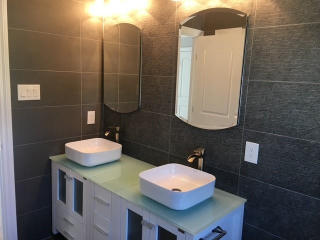 - Bathroom with tile walls, backsplash, double vanity, and toilet