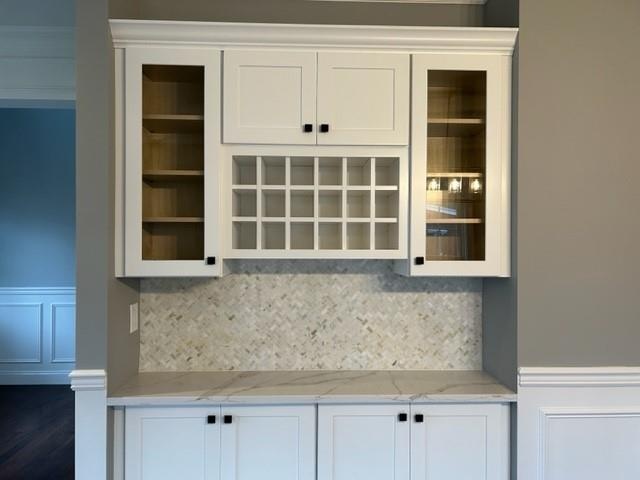 - Kitchen featuring beverage cooler, stainless steel appliances, ornamental molding, white cabinets, and glass insert cabinets