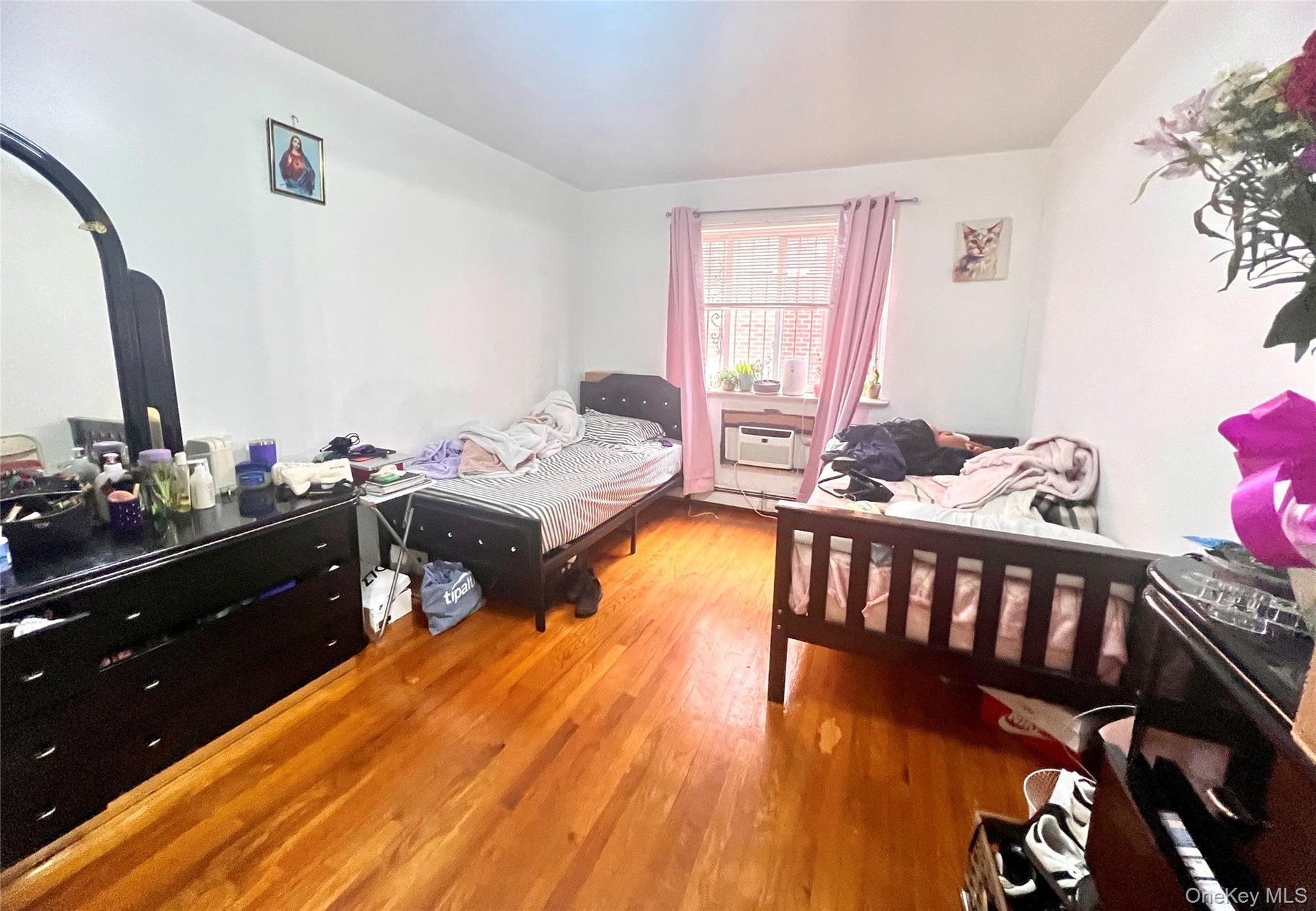 - Bedroom with wood finished floors, a wall unit AC, and a baseboard heating unit