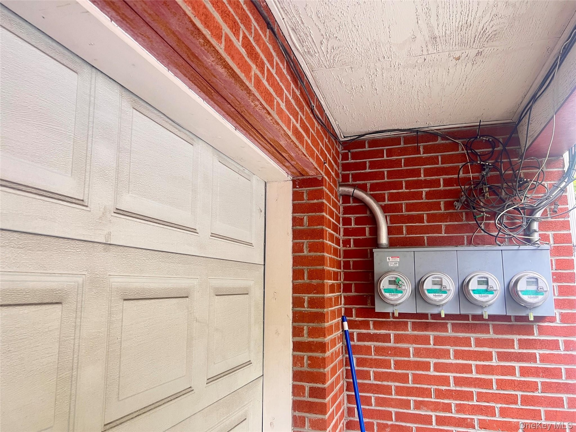 - Exterior view of electric meter and brick siding