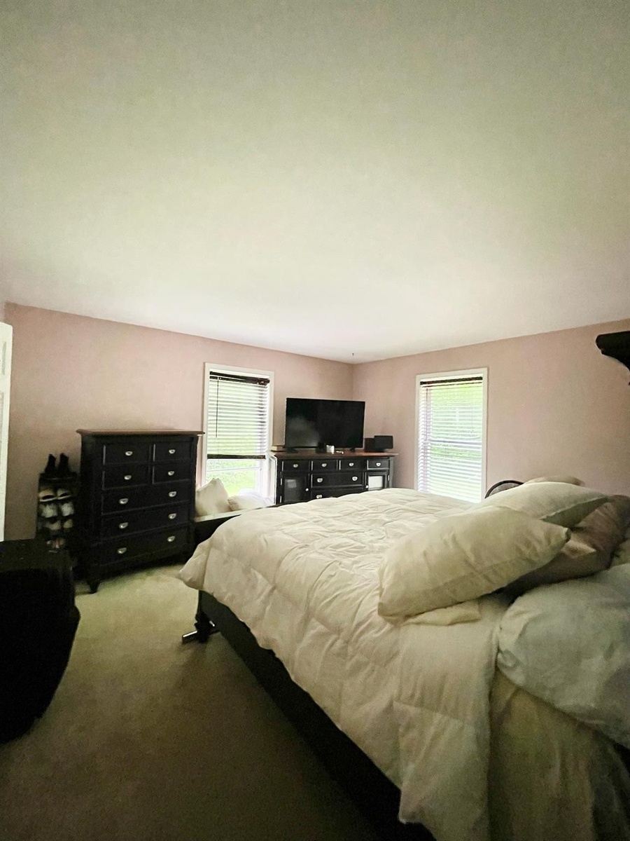 - Bedroom featuring a baseboard radiator and light colored carpet