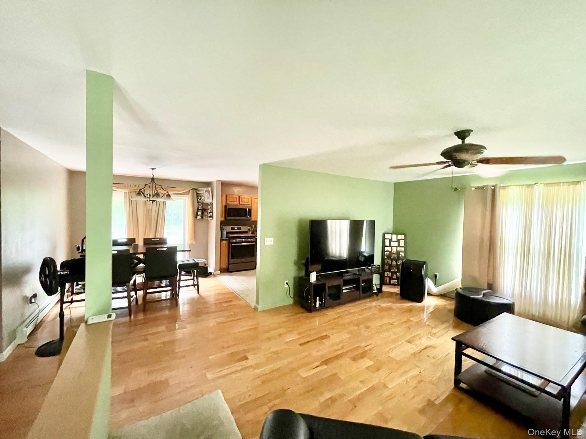 - Living room featuring a chandelier, light wood-style flooring, ceiling fan, and baseboards