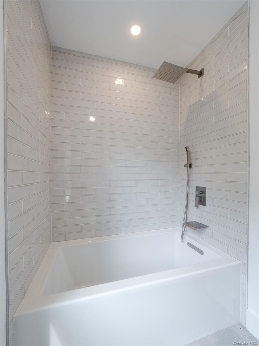 - Bathroom featuring double vanity, a soaking tub, recessed lighting, and marble tiled floors