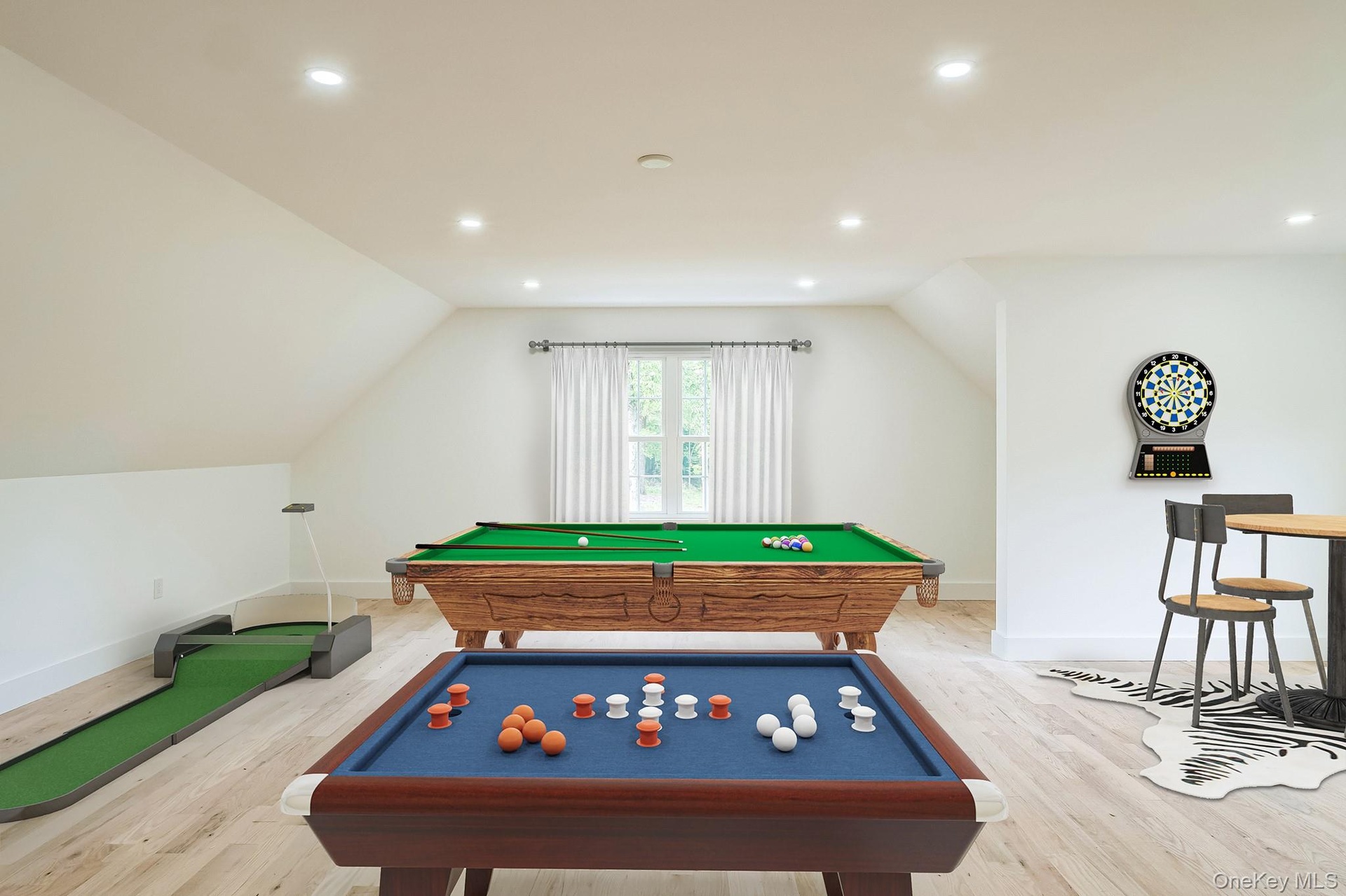 - Rec room with recessed lighting, light wood-type flooring, billiards table, and vaulted ceiling