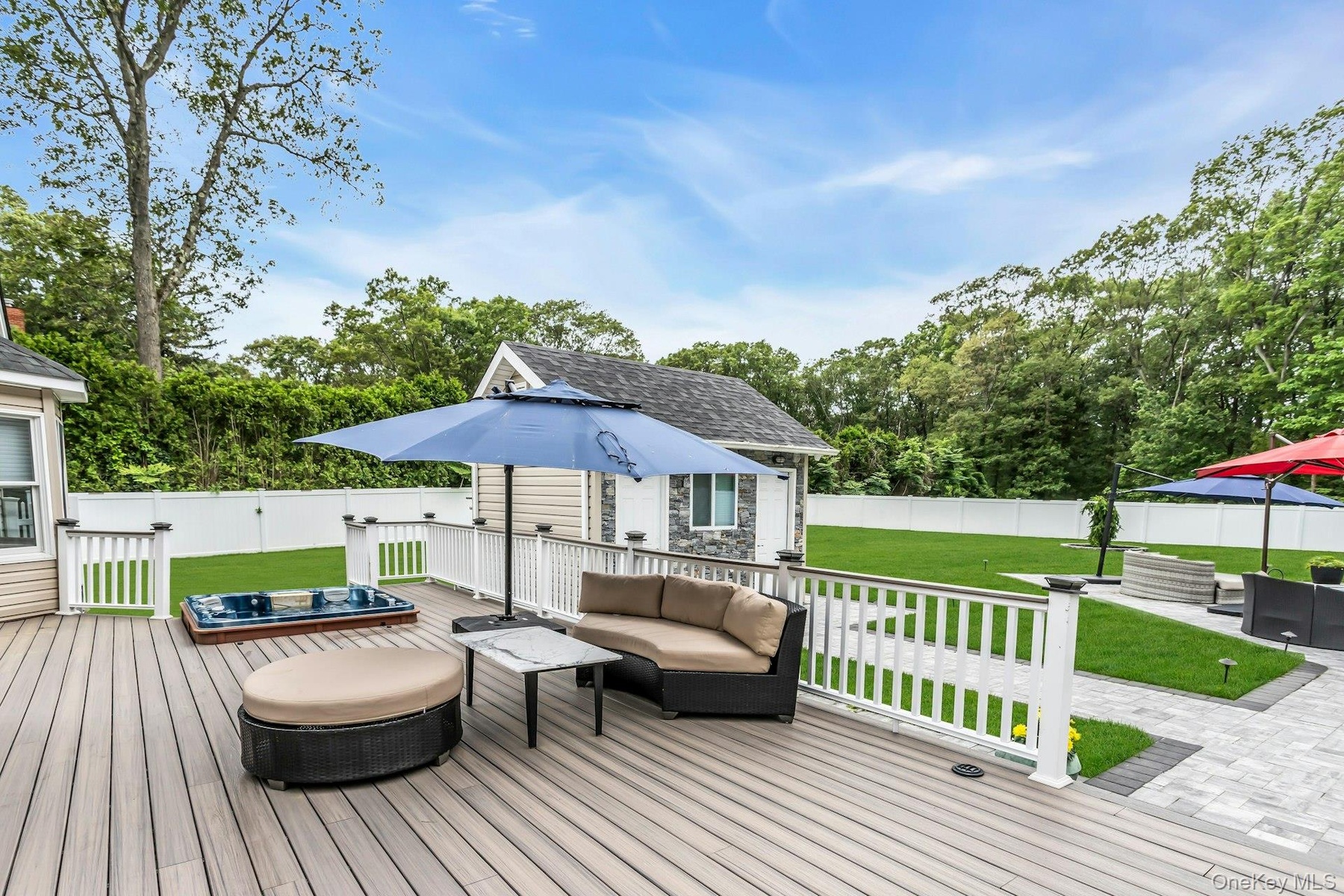 - Wooden terrace with an outdoor living space with a fireplace and a fenced backyard