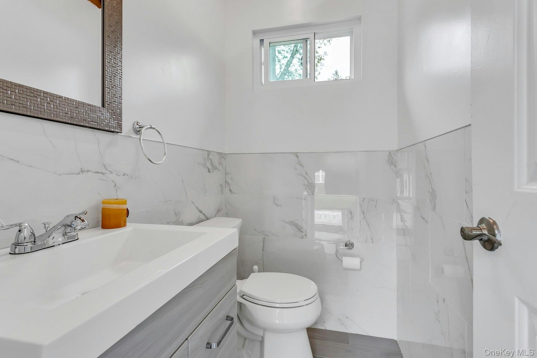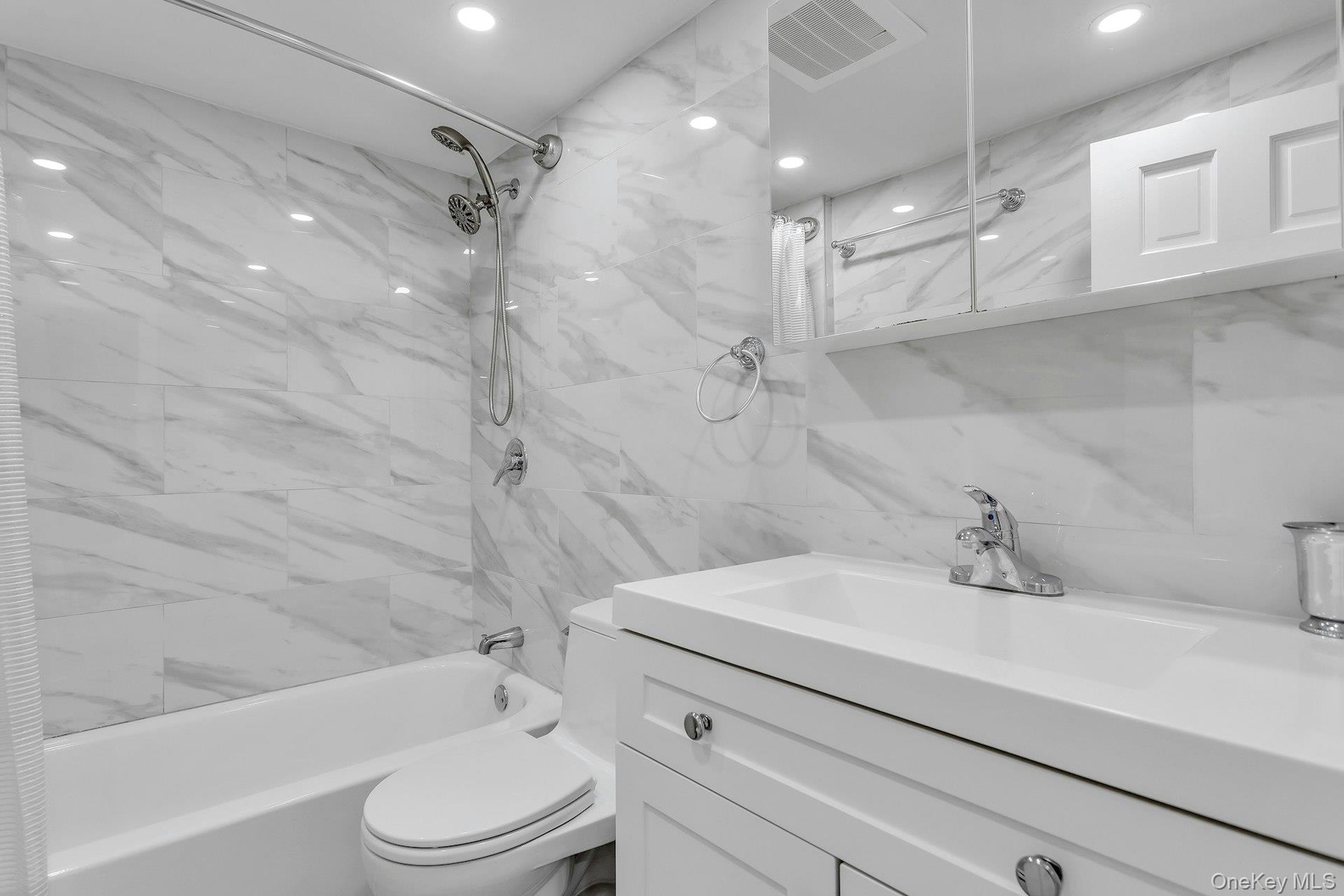 - Full bathroom featuring vanity, shower combination, tile walls, toilet, and recessed lighting