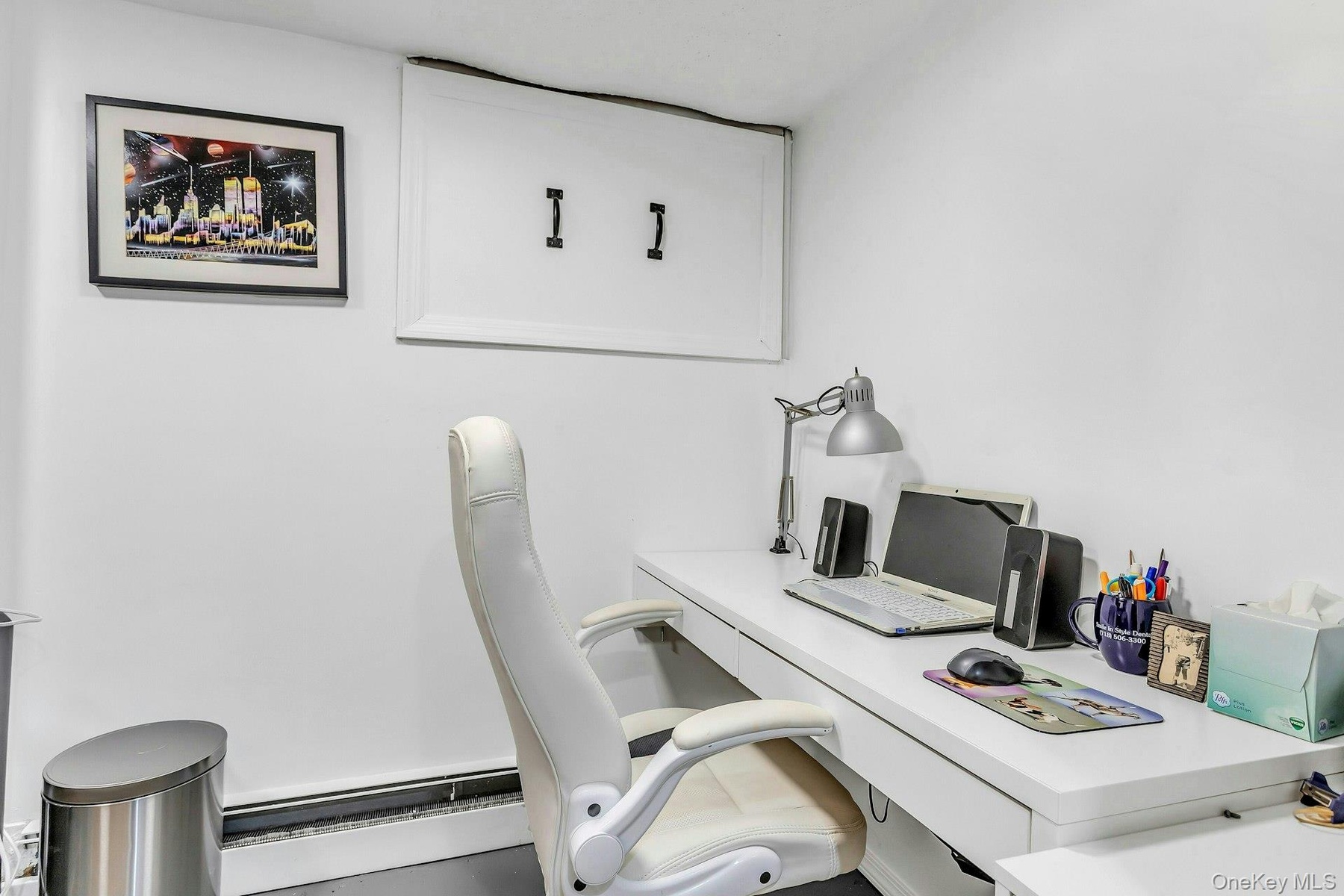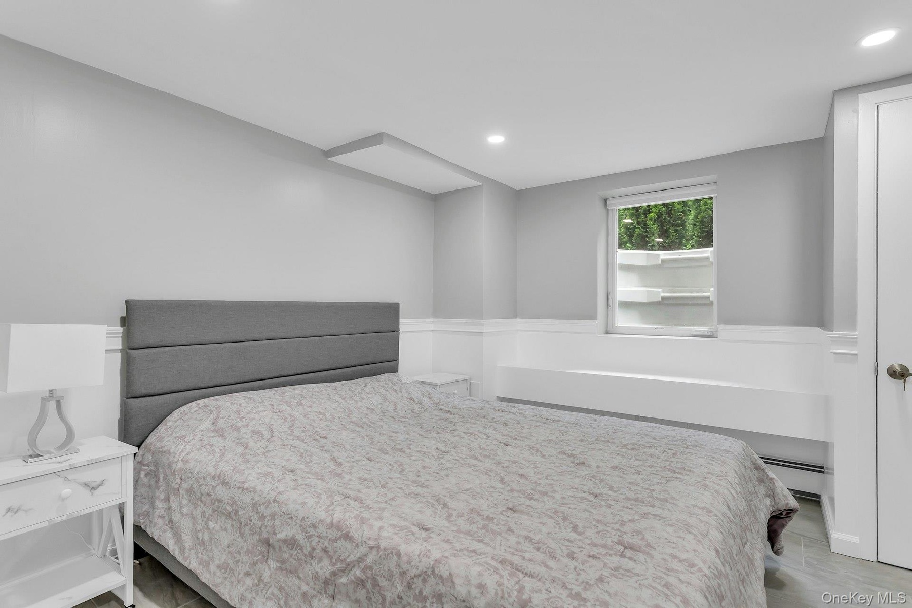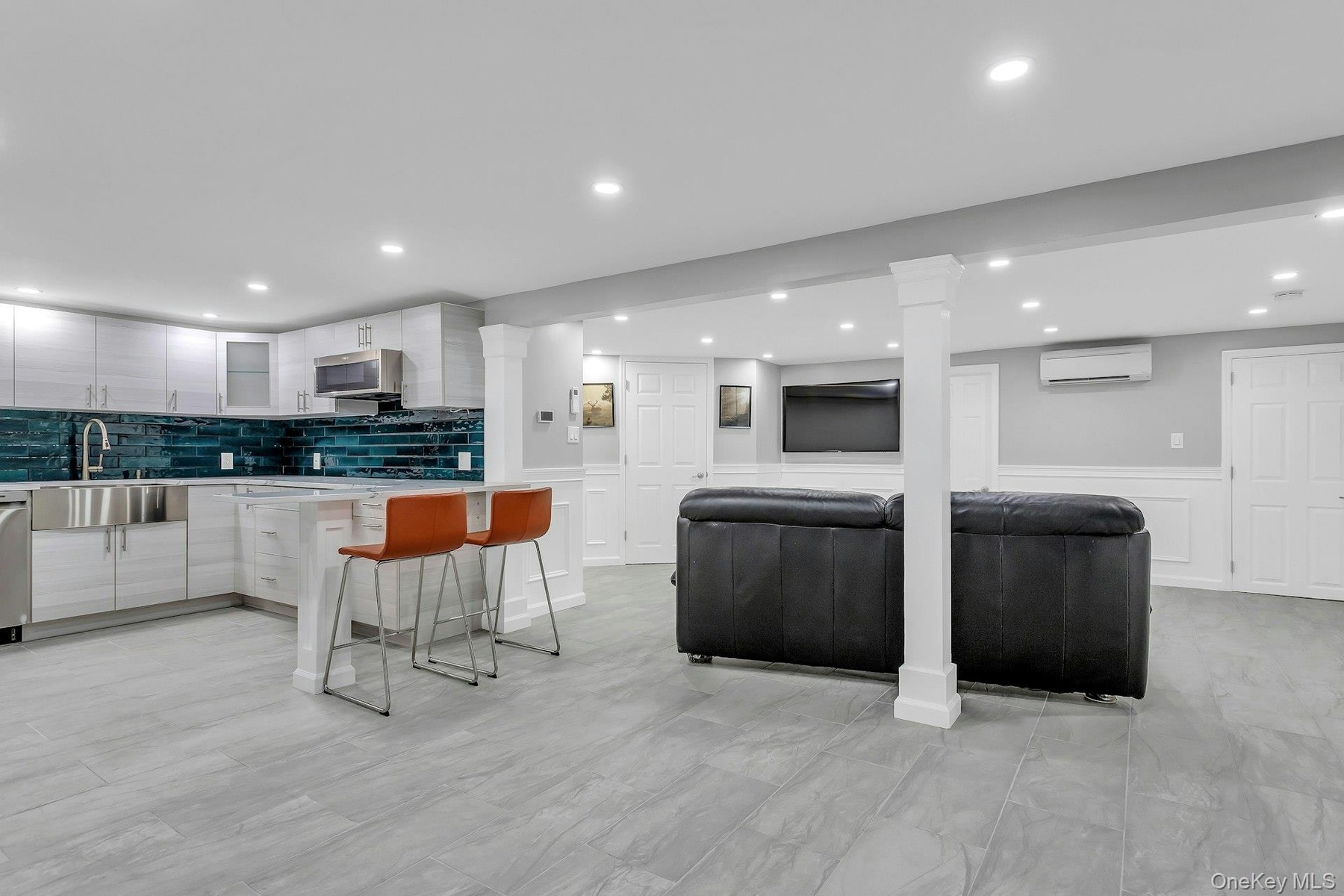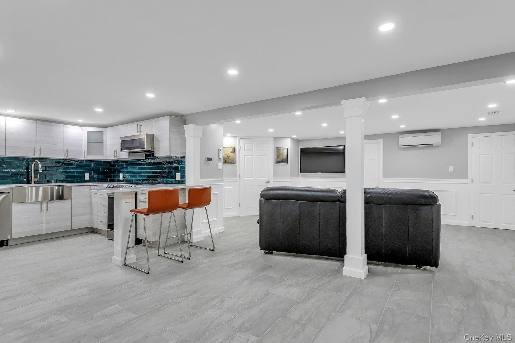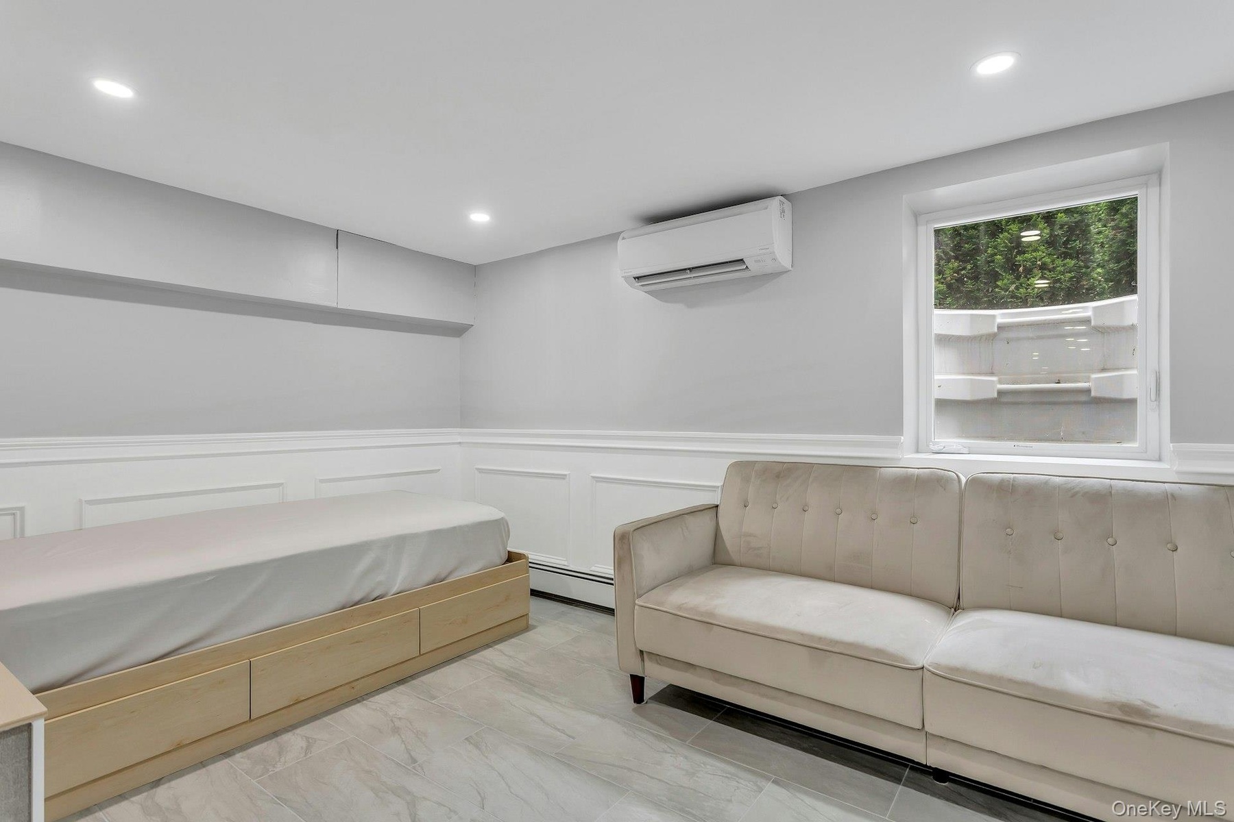 - Living area featuring a wall mounted AC, a wainscoted wall, recessed lighting, light marble finish floors, and a baseboard radiator