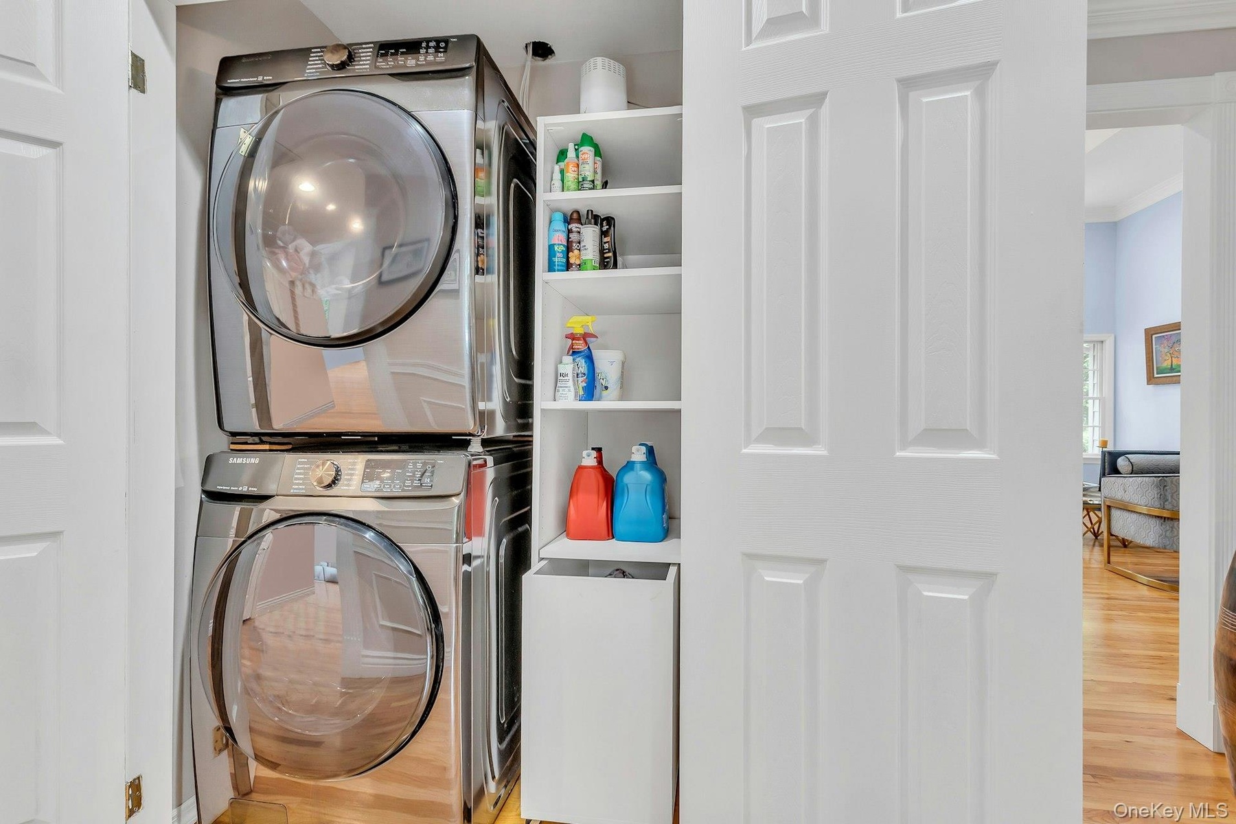 - Laundry room with stacked washer and clothes dryer, wood finished floors, and crown molding