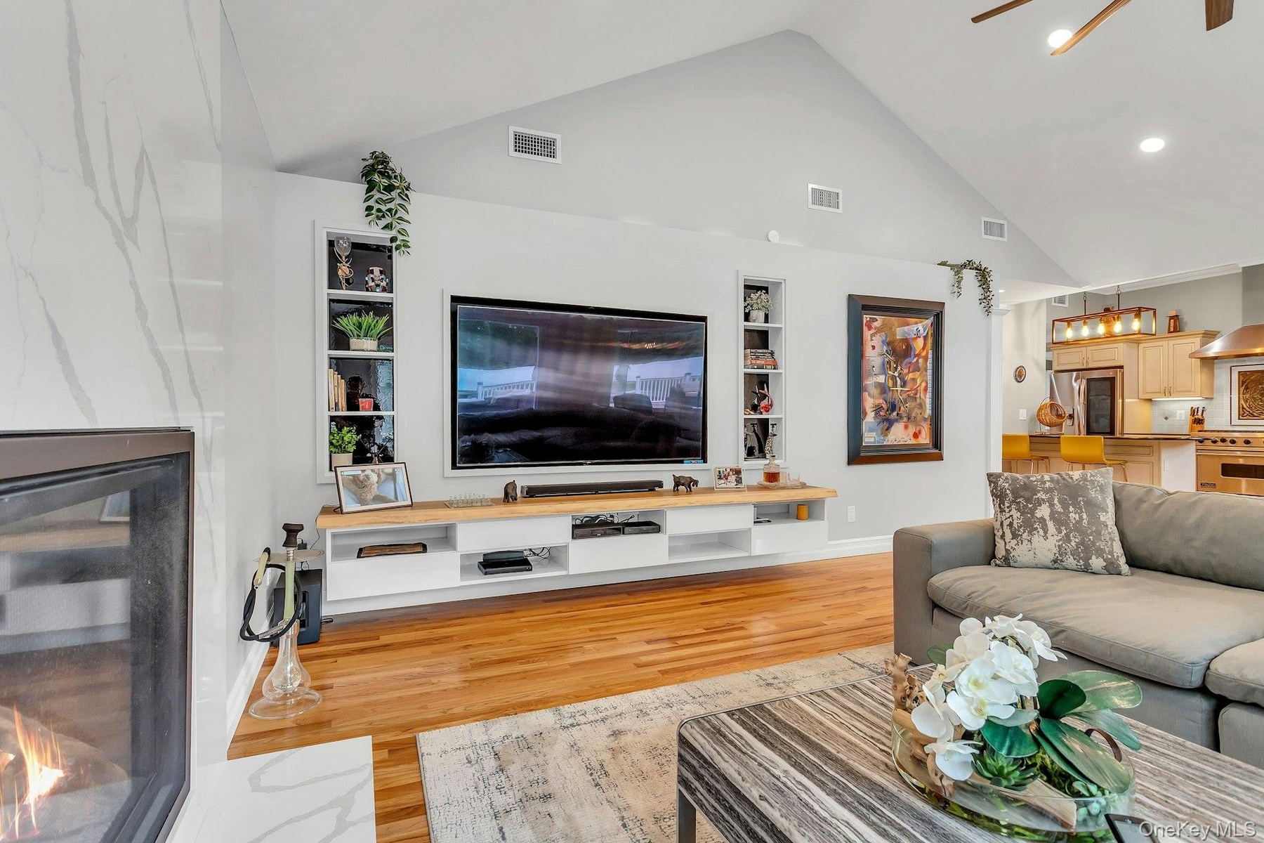 - Living area with built in features, wood finished floors, recessed lighting, high vaulted ceiling, and baseboards