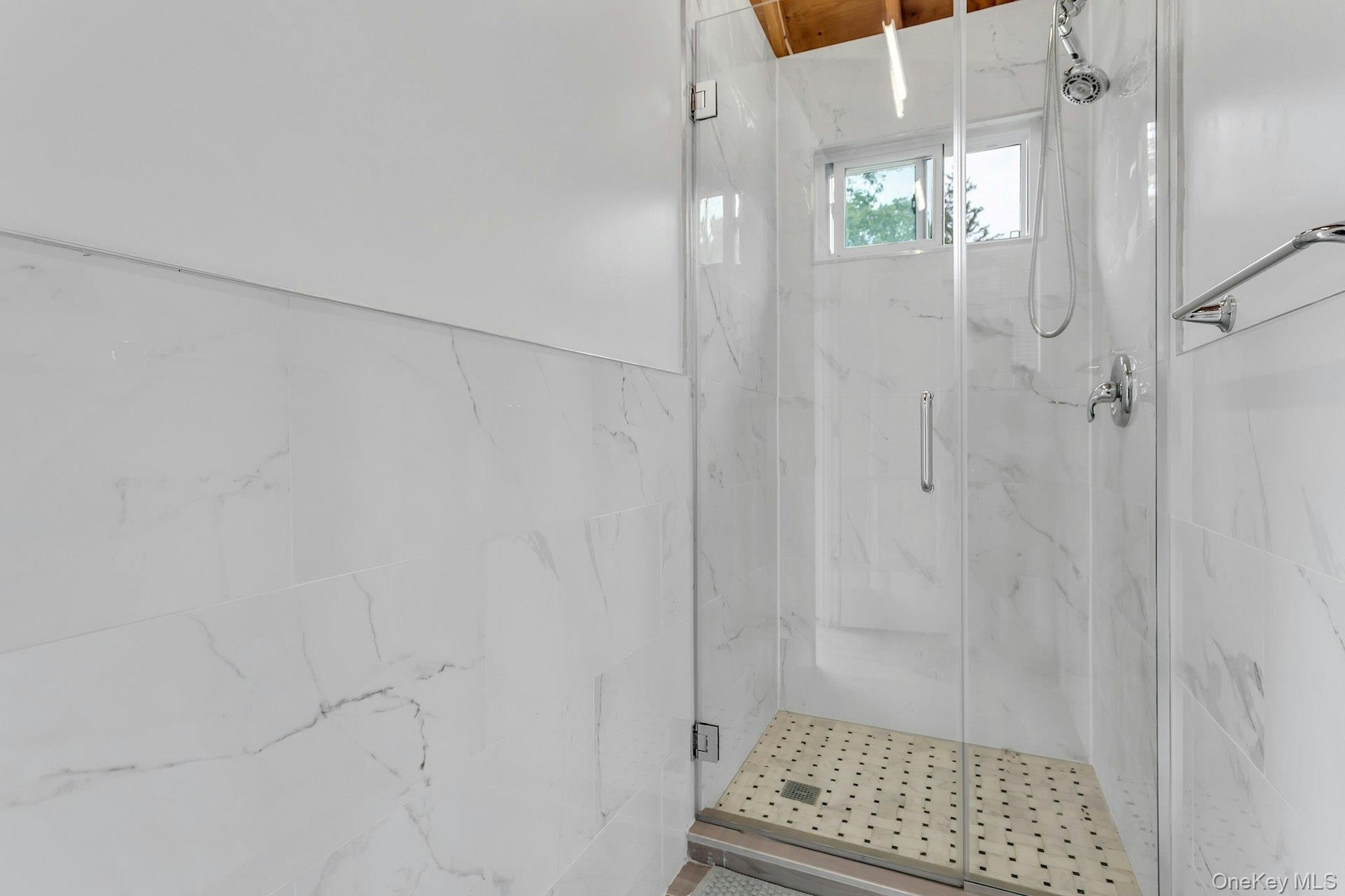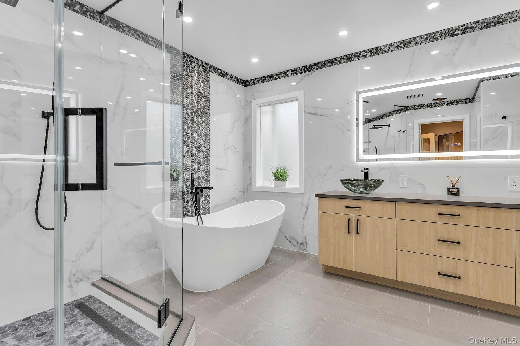 - Full bathroom featuring vanity, a marble finish shower, and a freestanding bath