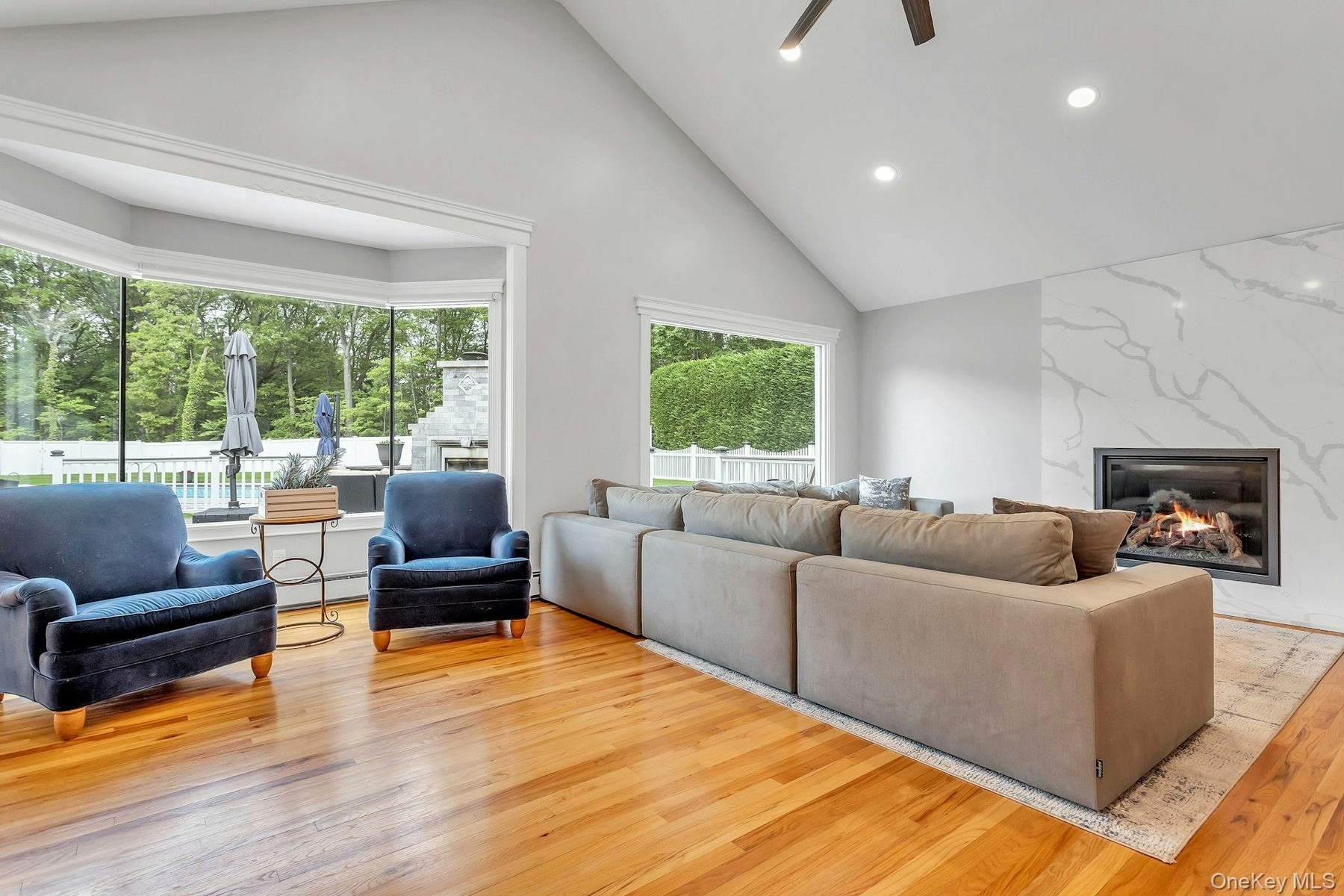 - Living room featuring light wood-style floors, high vaulted ceiling, a fireplace, a ceiling fan, and recessed lighting