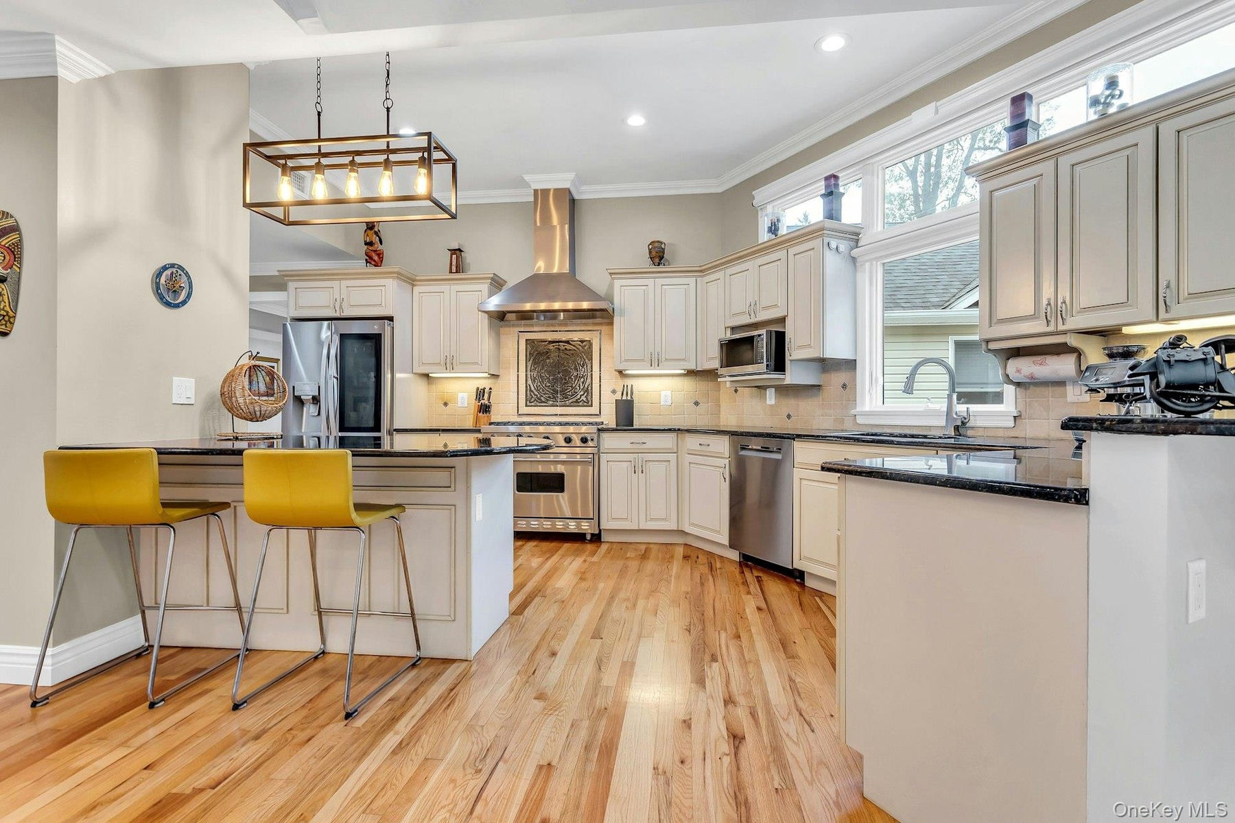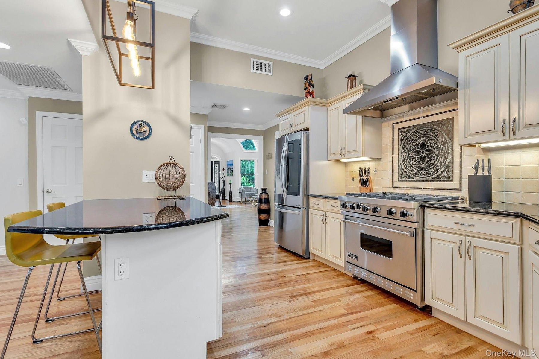 - Kitchen with exhaust hood, stainless steel appliances, crown molding, cream cabinets, and a breakfast bar