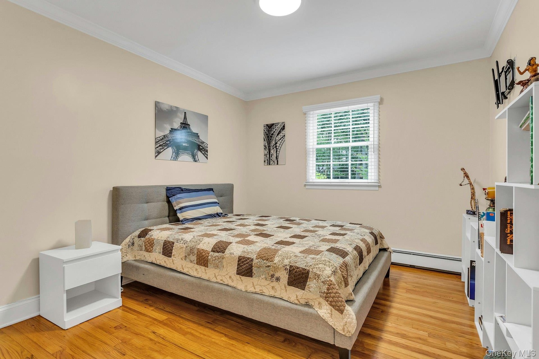 - Bedroom with baseboard heating, ornamental molding, and light wood finished floors