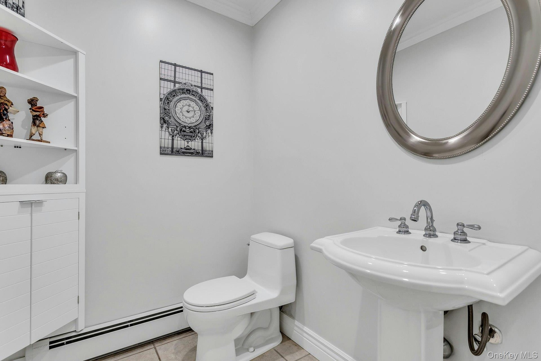 - Half bath featuring a baseboard radiator, tile patterned flooring, crown molding, toilet, and a sink