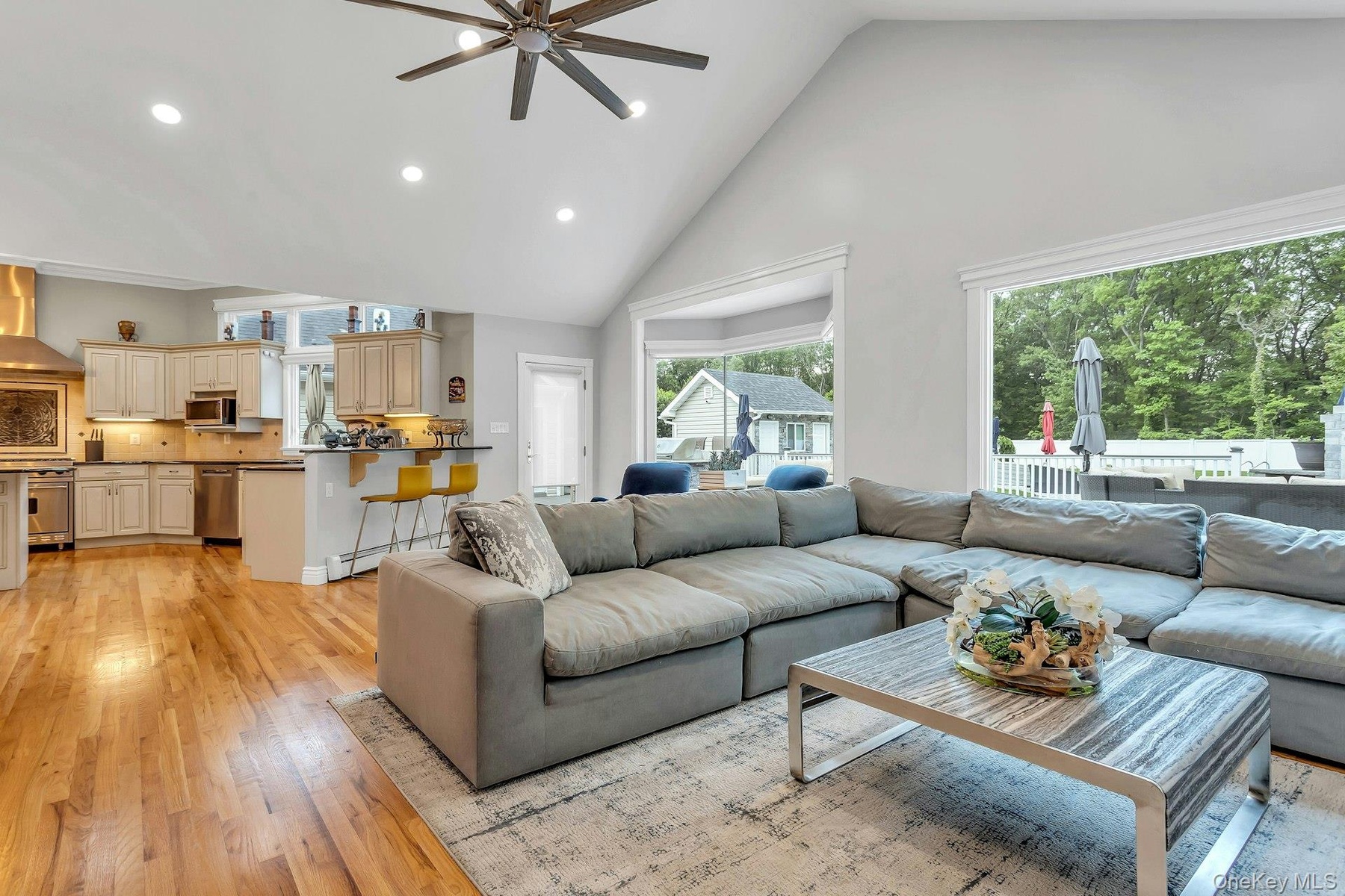 - Living area with ceiling fan, high vaulted ceiling, light wood finished floors, and recessed lighting