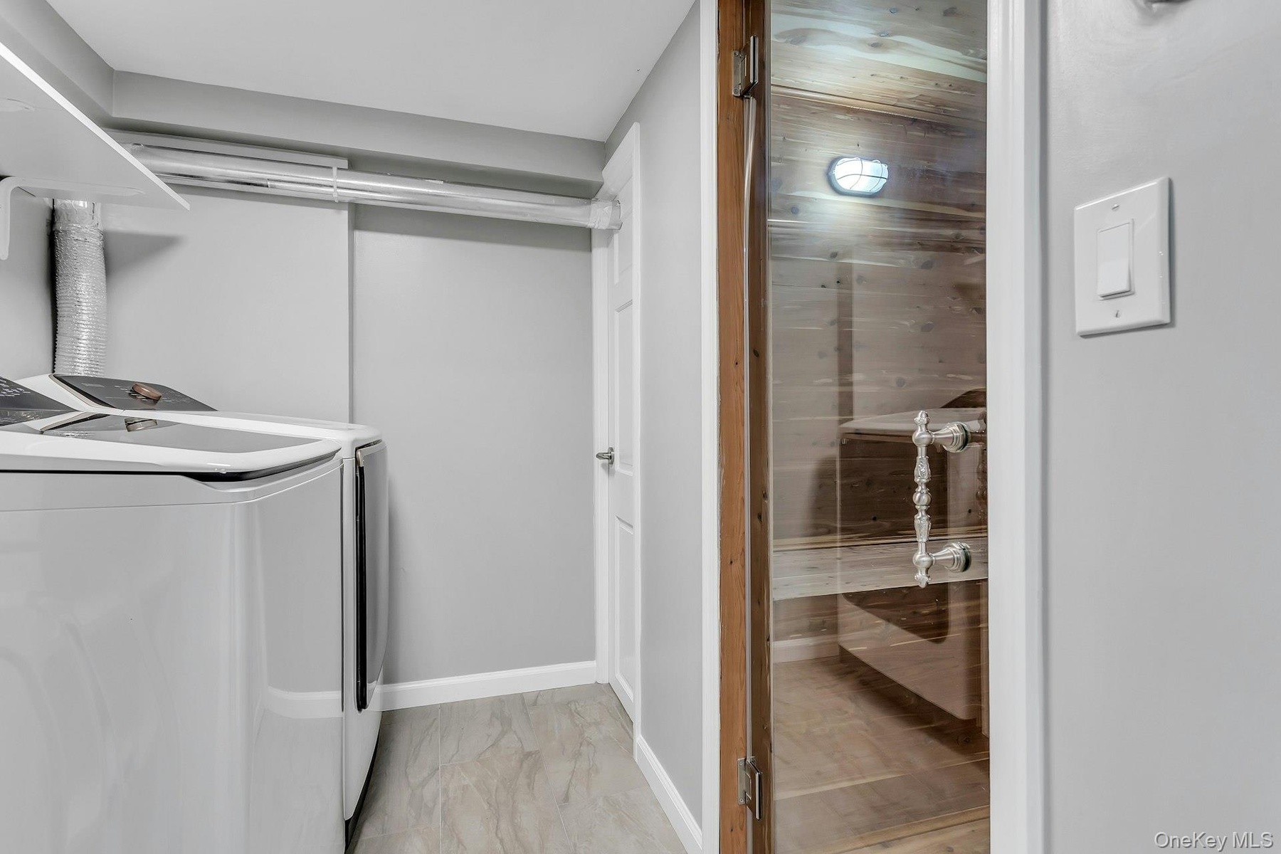 - Laundry area featuring washer and clothes dryer, light marble finish flooring, and baseboards