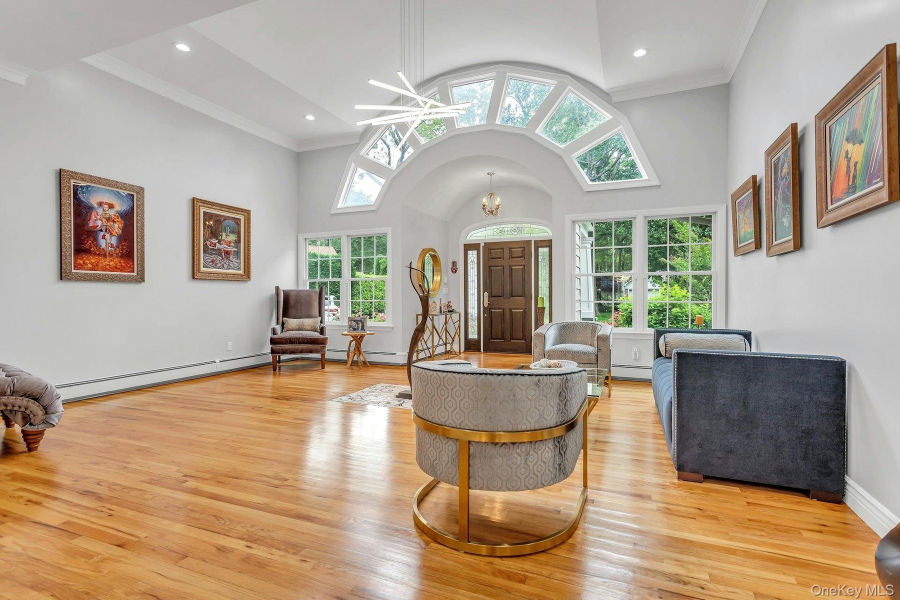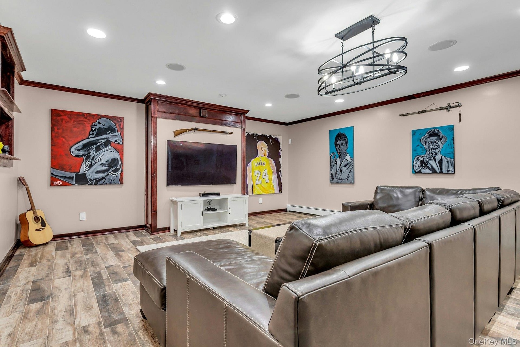 - Living room with crown molding, baseboards, light wood-type flooring, recessed lighting, and baseboard heating